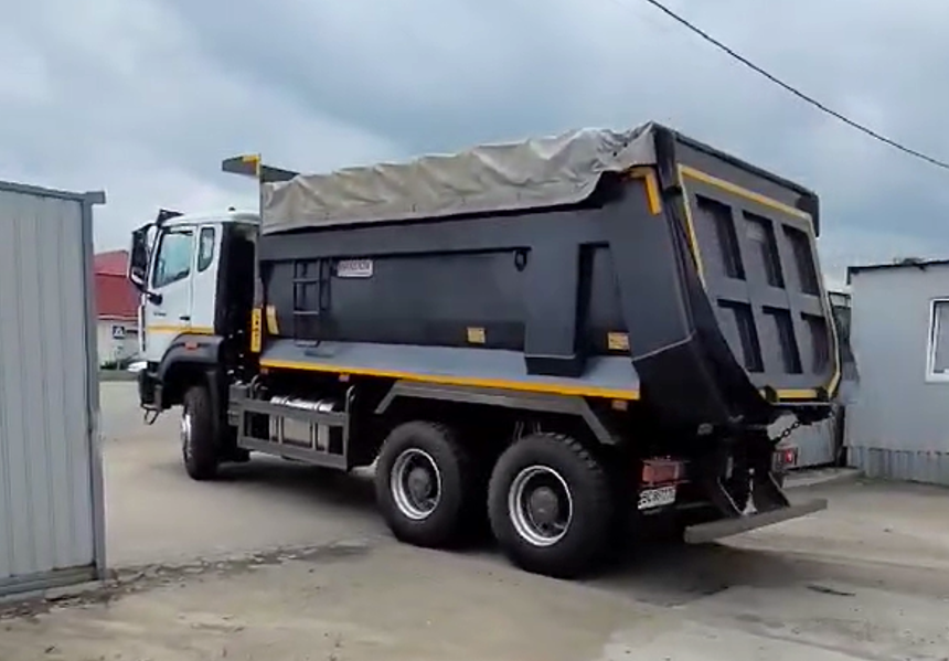 Автомобиль длиной 8200 мм, шириной 2500 мм и высотой 3500 мм имеет колесную базу 3800 мм. Он рассчитан на полную массу 41 т и грузоподъемность 25 т. Кузов полезным объемом 17 кубометров выполнен из сверхпрочной стали K450 (стенки – 6 мм, днище – 8 мм)и оборудован гидравликой Hyva.