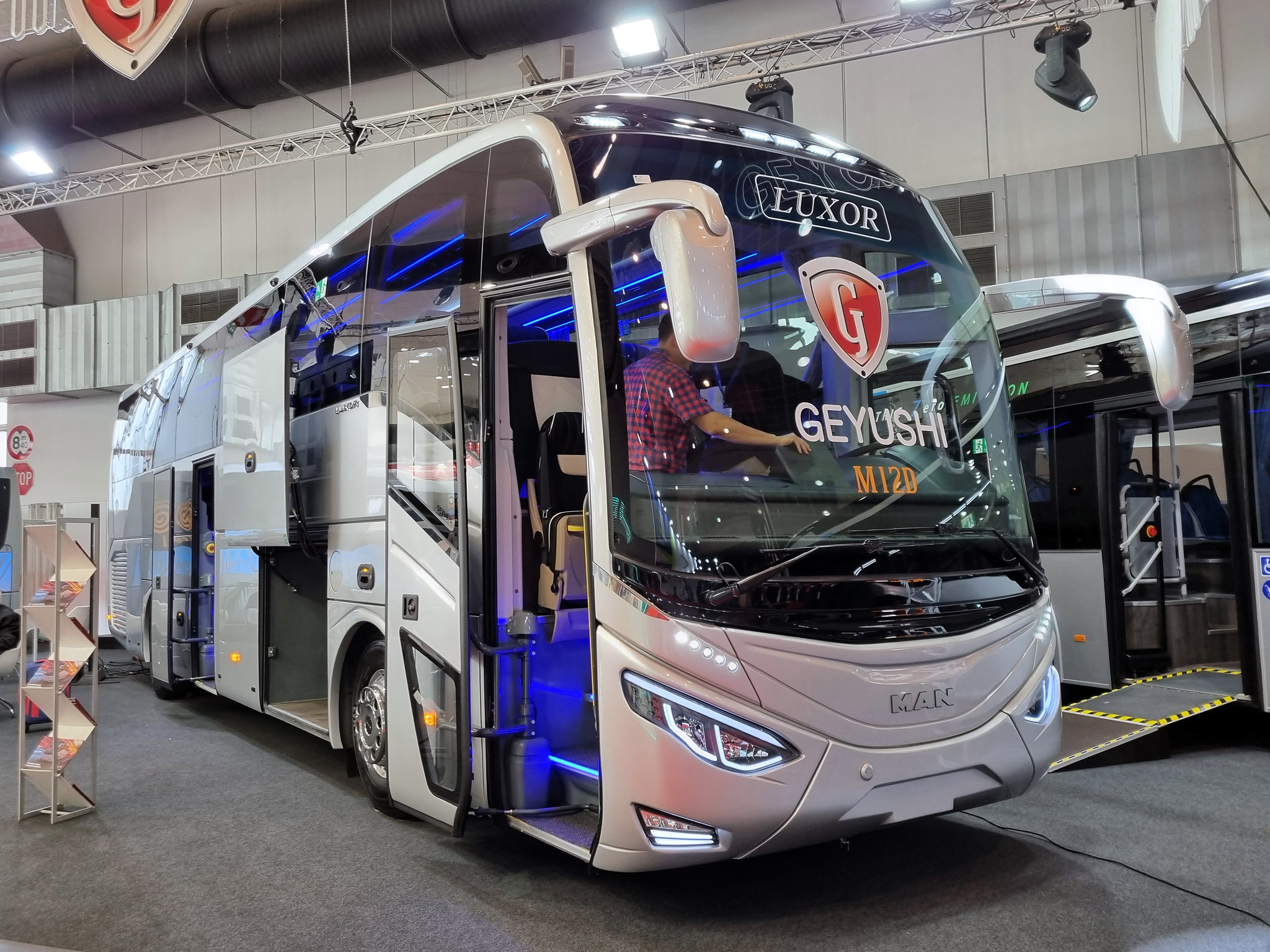 На стенде Geyushi Automotive Industry можно было увидеть три автобуса разных классов. Начнем с туристического лайнера Luxor M12D. Модель длиной 12,3 м имеет комфортабельный пассажирский салон на 49 мест. Здесь есть два потолочных монитора на 19 и 22 дюйма, кухонный блок, биотуалет. Багажные отсек имеет вместимость 13 кубометров. Двигатель установлен MAN, мощностью 430 л. с. Коробка передач – механическая или автоматическая. Подвеска – пневматическая.