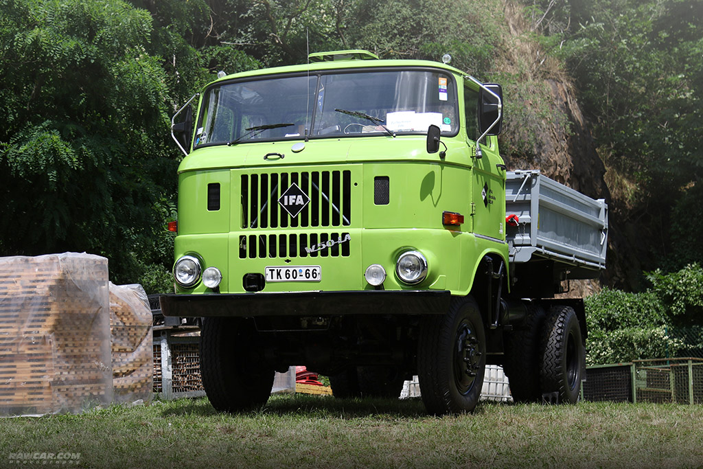 Самым массовым грузовиком из ГДР была «пятитонка» IFA W50L, выпускаемая на бывшем заводе авиадвигателей в городе Людвигсфельде (4 цил., 6,56 л., 125 л. с., 90 км/год). С 1965 года в течение 20 лет было изготовлено 430 тыс. таких машин. На выставке был представлена версия самосвала с трехсторонней разгрузкой.