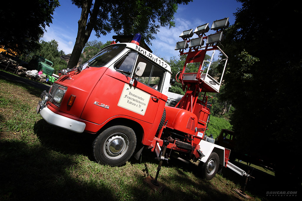 Приехал на выставку и оригинальная пожарная осветительная автовышка на шасси легкого развозного автомобиля Hanomag F25, который выпускался в 1967 – 1969 гг. Автомобиль грузоподъемностью 1200 кг оснащался 1,8-литровым дизелем в 50 л. с.