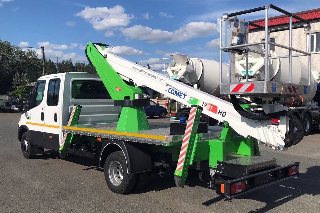 Автогидроподъемник установлен на малотоннажнике IVECO Daily 70C160, которое оснащено двухрядной кабиной на 7 человек. Заметим, что в данном случае шасси рассчитано на полную массу 7 т, хотя для данной модели 18-метровой автовышки Comet могут использоваться и более легкие шасси – полной массой от 3,5 т.
