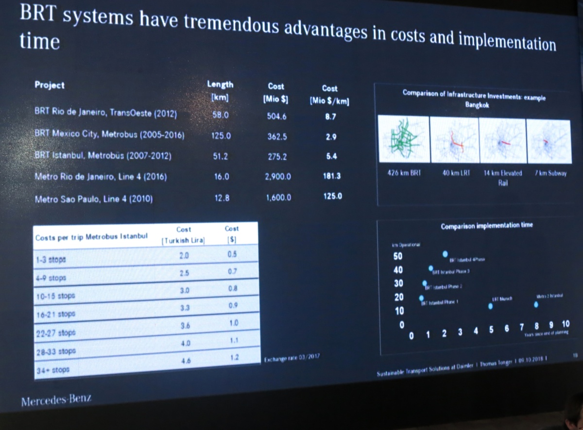 Итак, система скоростного автобусного сообщения BRT сегодня распространена во многих крупнейших городах. Из 168 маршрутов по всему миру на 41-м работают автобусы Mercedes-Benz. На сегодняшний день таких машин изготовлено свыше 21 тыс. ед.