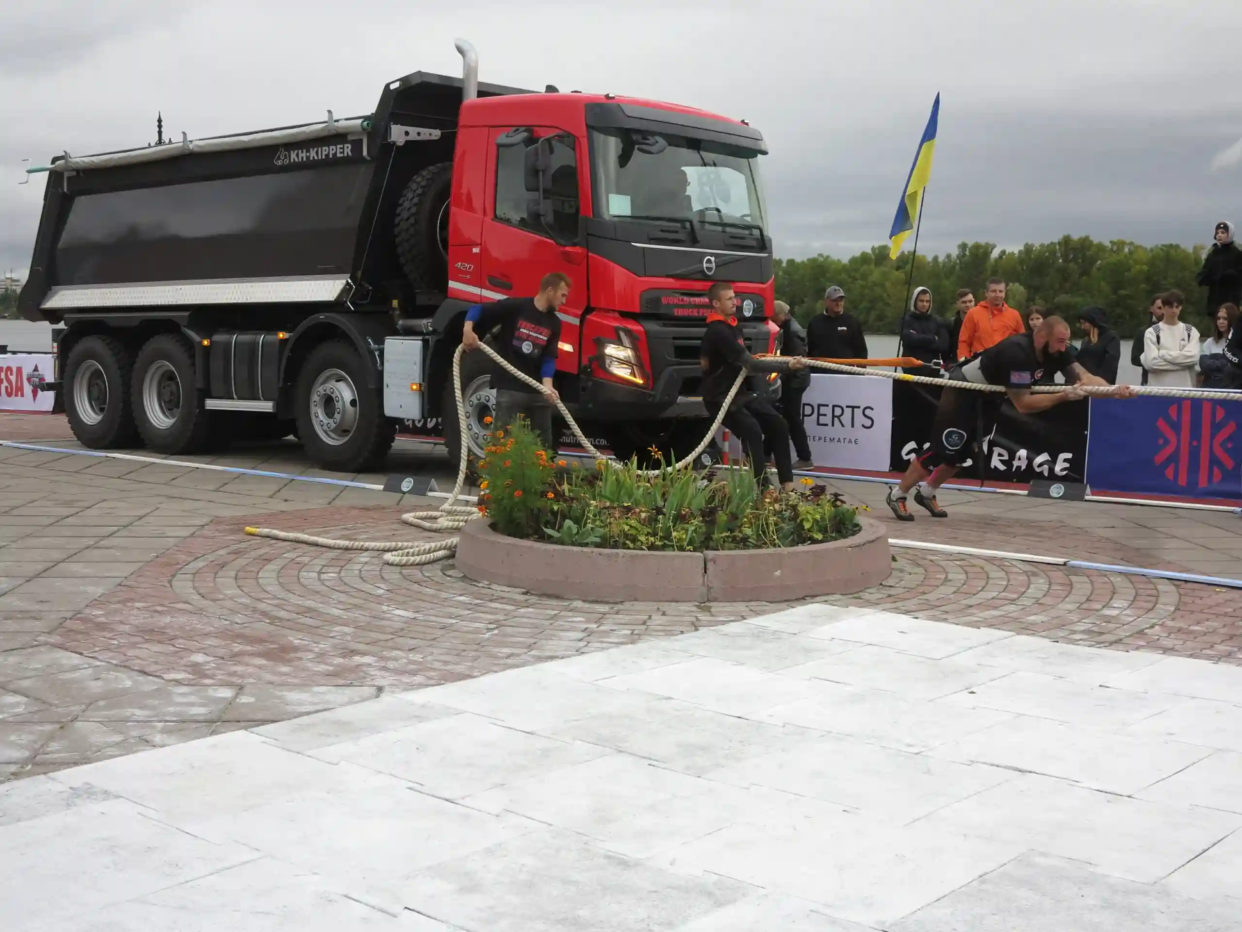 Спортсмены состязались в трех видах упражнений. На первом каждый из них тянул за собой с помощью лямок седельный тягач Volvo FH массой 8 т. На втором богатыри уже в положении, с помощью каната тянули на себя трехосный самосвал Volvo FMX весом уже 14 т.