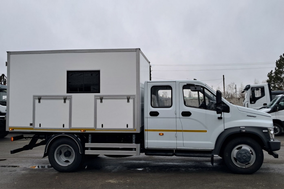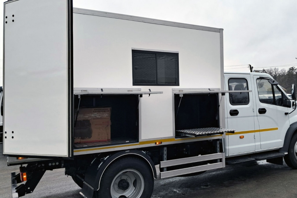 Кузов-фургон производства «Техкомплект» в данном случае полностью отведен под технологический отсек, так как для ремонтная бригада спокойно помещается в двухрядной кабине. Справа по борту надстройка имеет два отсека с наружным доступом, предназначенных для различного оборудования, в том числе генератора. В корме расположена широкая двустворчатая дверь, посадку-высадку облегчают выдвижная лесенка и поручень. Внутри установлен металлический шкаф с закрывающимися на ключ отсеками под специнструмент.