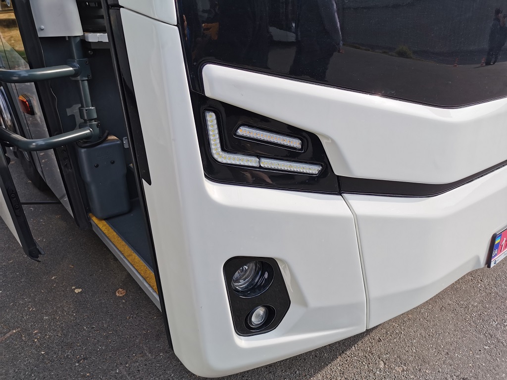 Машина привлекает внимание своим необычным дизайном, особенно впечатляет передняя маска – с оригинальным оформлением светотодиодных указателей поворота и дневных ходовых огней. Интересна и корма автобуса.
