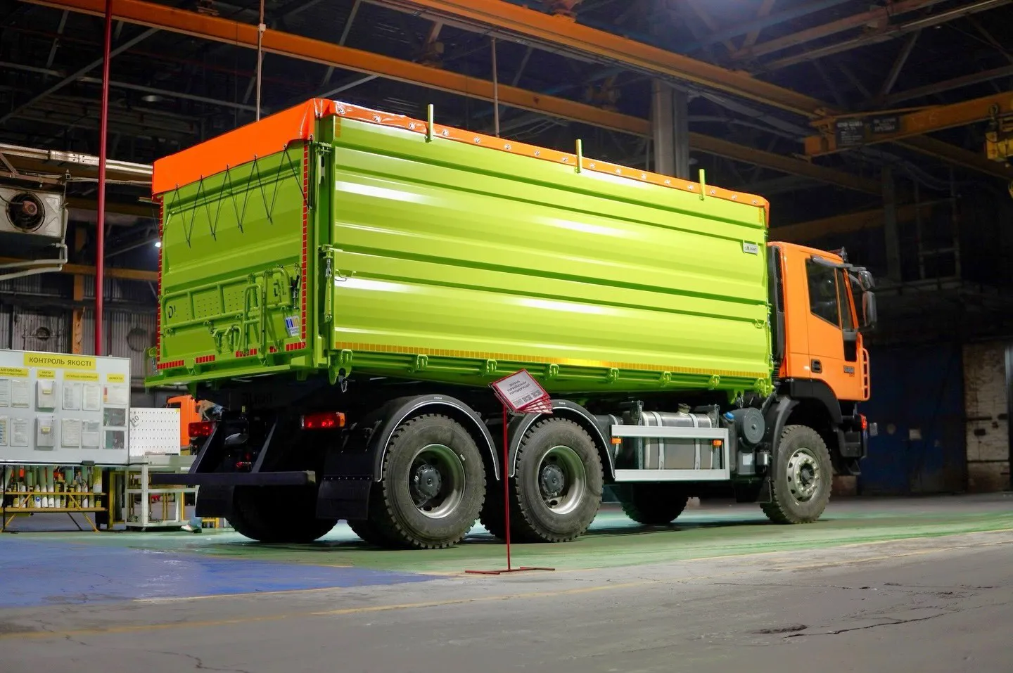 Она имеет колесную формулу 6х4 и рассчитана на полную массу 33,5 т при грузоподъемности 19,5 т. Применяется мощная рама с двойным C-образным профилем. На машине установлен самосвальный, 20,5-кубовый кузов трехсторонней разгрузки от украинского предприятия DLight.