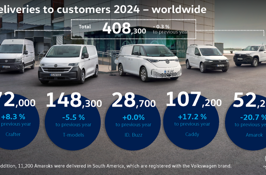 Подразделение Volkswagen Commercial Vehicles завершило 2024 год с показателями продаж 408 300 ед., что на уровне 2023-го – 409 400 ед. Доля аккумуляторно-электрических машин (BEV) cоставила 7%. Наибольший рост продемонстрировали модели Caddy, Crafter и Multivan. В ушедшем году закончилось обновление всего модельного ряда коммерческих автомобилей и теперь он самый широкий за всю историю бренда.