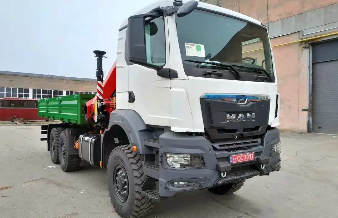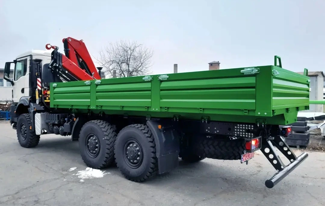 На днях Завод спецтехники «Техкомплект» поставил заказчику очередную партию грузовиков TK-TGS-КМ-215+КМУ. На шасси MAN TGS 33.400 колесной формулы 6х6 установлена бортовая платформа собственного производства. Металлический кузов длиной 6060 мм и шириной 2550 мм имеет откидные борта высотой 600 мм и оснащен быстросъемными стойками. Пол изготовлен из рифленой стали.