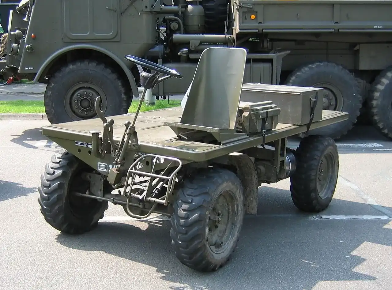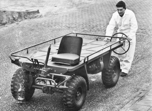 Интересно, что название Pony для мини-грузовичка было позаимствовано с военного. Оказывается, в 1963 году Пентагон заказал компании DAF разработать легкий армейский транспортер. В итоге в 1964 году появилась компактная самоходная тележка (3,05 х 1,27 х 1,28 м), напоминающая стол на колесах. Здесь не было привычного кузова. Водитель сидел спереди, открытый всем ветрам. В боевой обстановке рулевую колонку можно было сложить и уменьшить высоту автомобиля до 0,96 м. Водитель при этом мог управлять автомобилем, передвигаясь за машиной ползком - для чего на корме имелись дополнительный руль и соответствующие рычаги.
