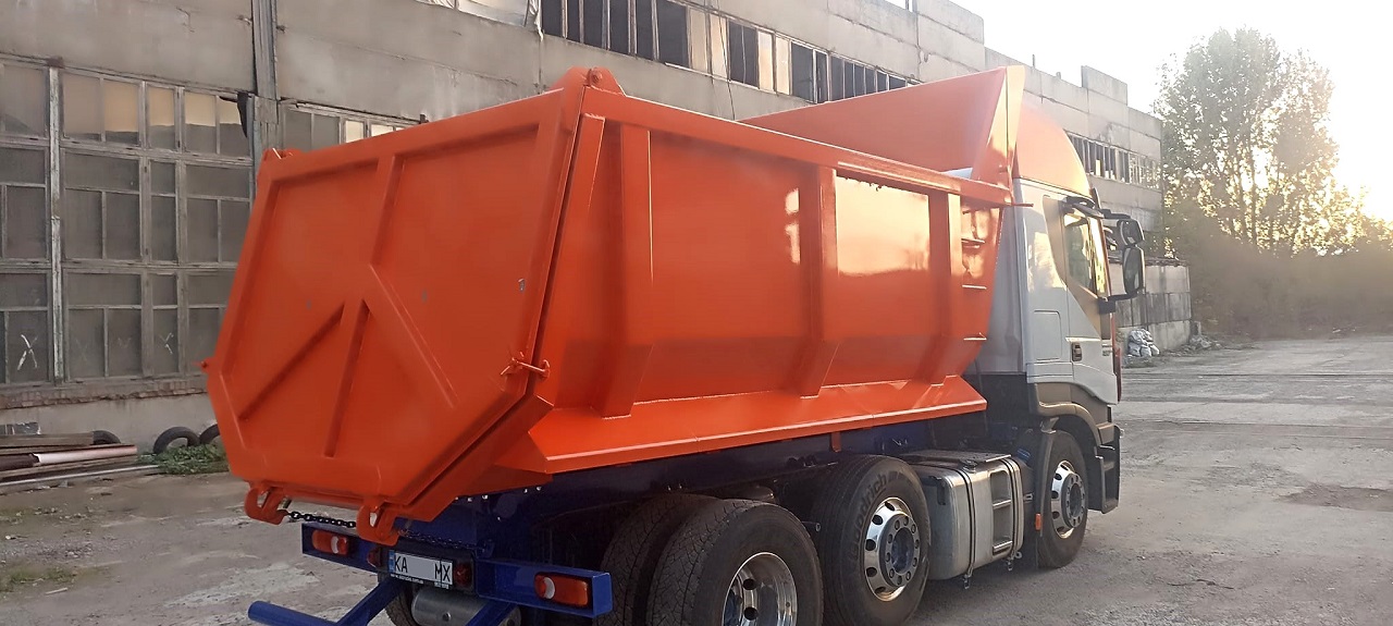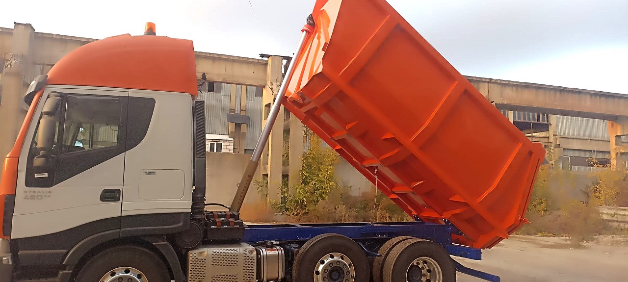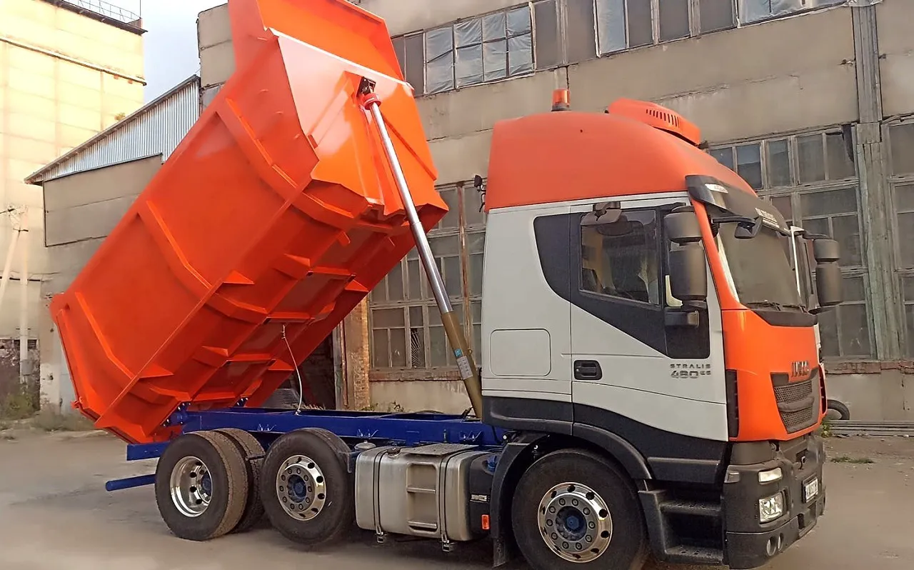 На тягаче установили довольно емкий кузов полукруглой формы типа Half-Pipe. Толщина стенок составляет 4 мм, а днища – 8 мм. Для подъема/опускания платформы служит гидроцилиндр турецкой марки Hidromas.