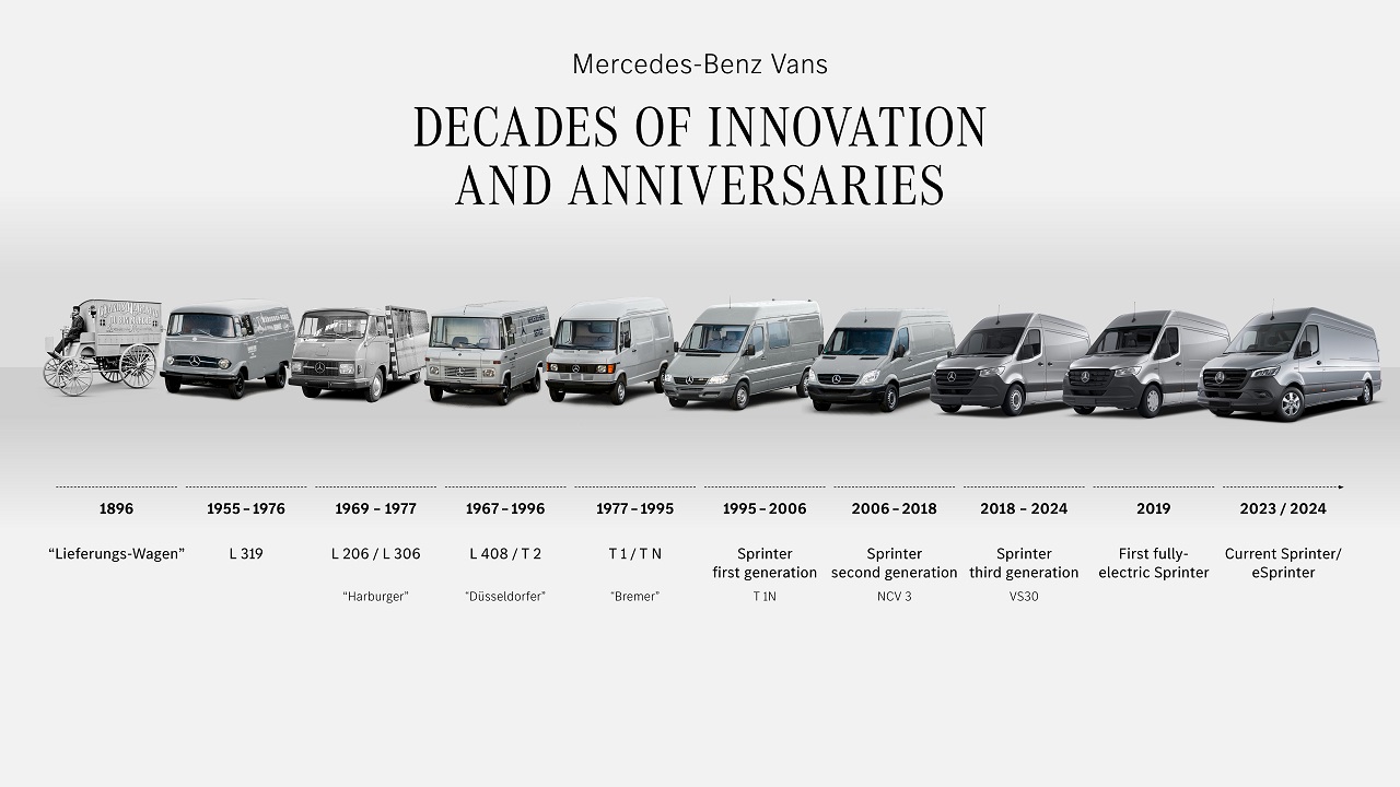 Sprinter последовал за Mercedes‑Benz T1/TN, настоящей легендой, выпущенной за 18 лет почти миллионым тиражом. Хотя он перенял базовую техническую концепцию T1/TN, все остальное было революционным. Сочетание самонесущего кузова, заднего привода с высокой тягой, современного шасси с независимой передней подвеской, передовой безопасности и мощных двигателей было уникальным. С самого начала Sprinter позиционировался как настоящий универсал. Благодаря множеству вариантов и опций он стал выбором номер один во всех отраслях и остается таковым по сей день.