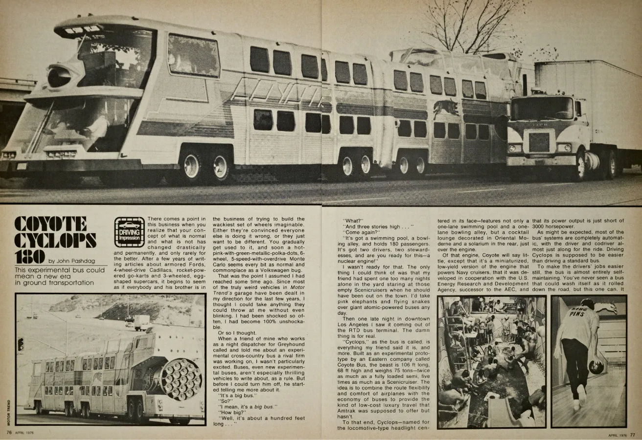 Цей футуристичного виду двоповерховий автобус був побудований для комедійного фільму The Big Bus від Paramount Pictures, що вийшов на екрани в 1976 році. Машина, названа Cyclops («Циклоп») через велике «око» в носовій частині, була завдовжки 33,5 м, заввишки 5,5 м та завширшки 3,15 м.