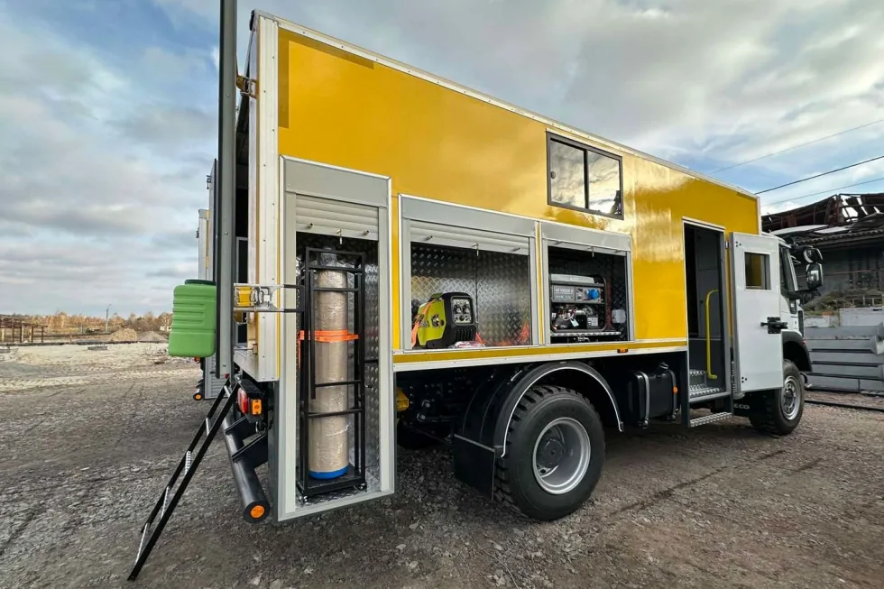 Второй отсек – технологический, с распашными дверями в корме. Здесь установлены шкафы под баллоны сварочного поста и отсек для дизельного генератора – с наружным доступом. Внутри также есть верстат и стеллаж шириной 500 мм с тремя полками. Оба отсека оборудованы экономичными LED-плафонами.