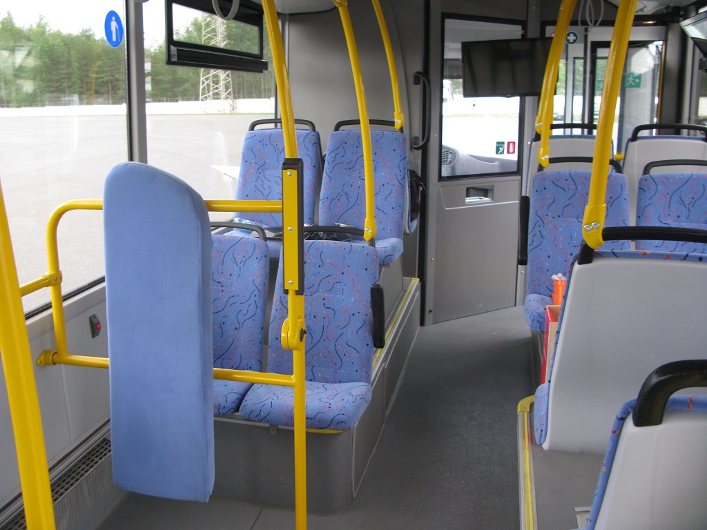 Для посадки-высадки нужно преодолеть три ступеньки, нижняя из которых расположена над уровнем дороги всего в 340 мм. В салоне установлены 33 комфортабельные кресла – с развитой боковой поддержкой, откидными подлокотниками и двухточечными ремнями безопасности. А вот спинки не откидываются, на спинках крайних от прохода сидений имеются поручни – для стоящих пассажиров. Всего же автобус рассчитан на перевозку до 59 человек, не считая водителя. Слева по борту имеются багажные отсеки полезным объемом до 2,8 кубометра.