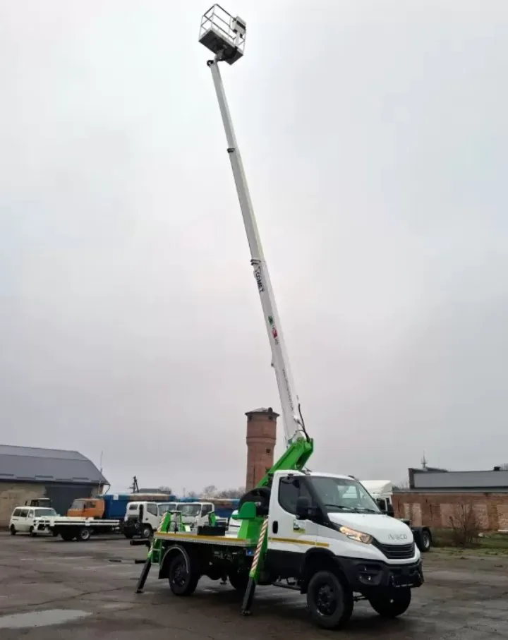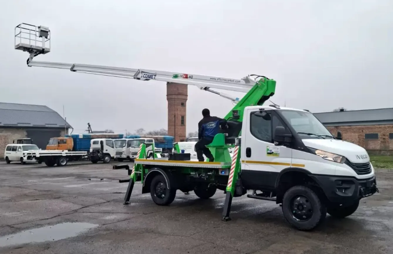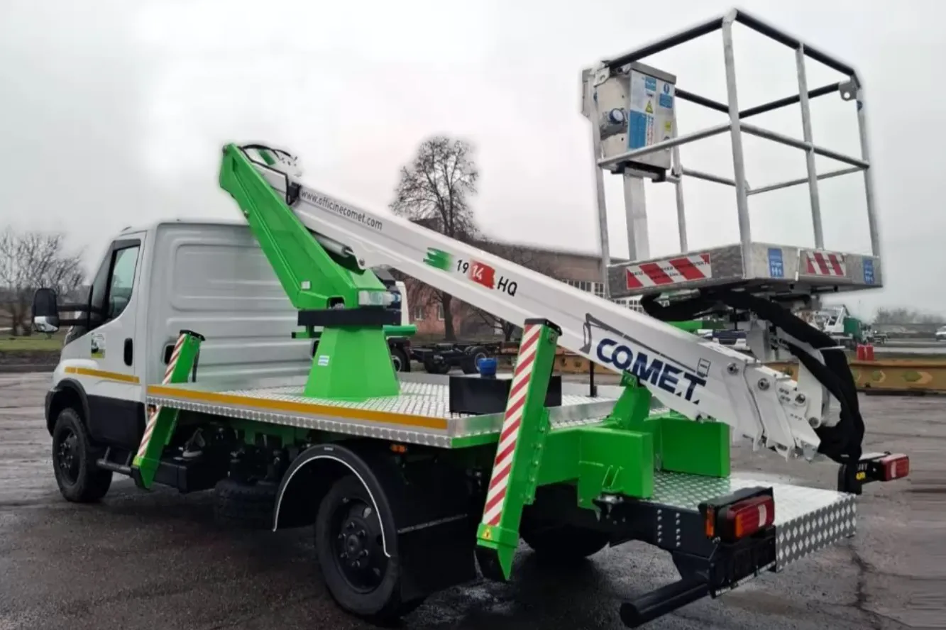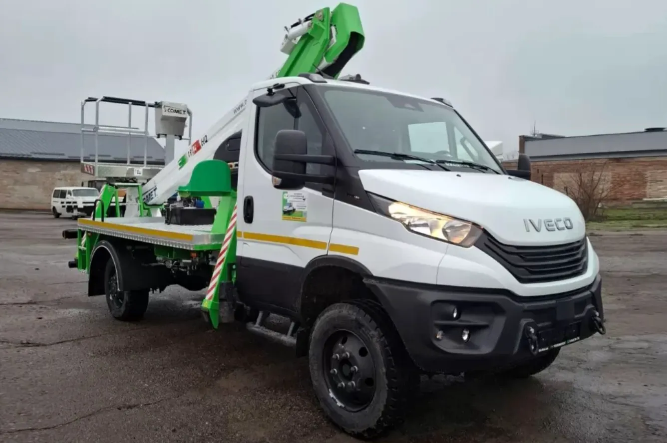 Второй автогидроподъемник на полноприводном шасси – от итальянского производителя Comet и предназначен для энергетиков Тернополя. На вездеходном шасси IVECO Daily 55S18H (4х4) установлена самая востребованная на украинском рынке модель автовышки, Comet 19-2-14HQ, обеспечивающая рабочую высоту до 18 и максимальный вылет 14 м. Корзина рассчитана на 250 кг и может поворачиваться на 90 + 90 град. Телескопическая стрела имеет угол поворота до 360 град.
