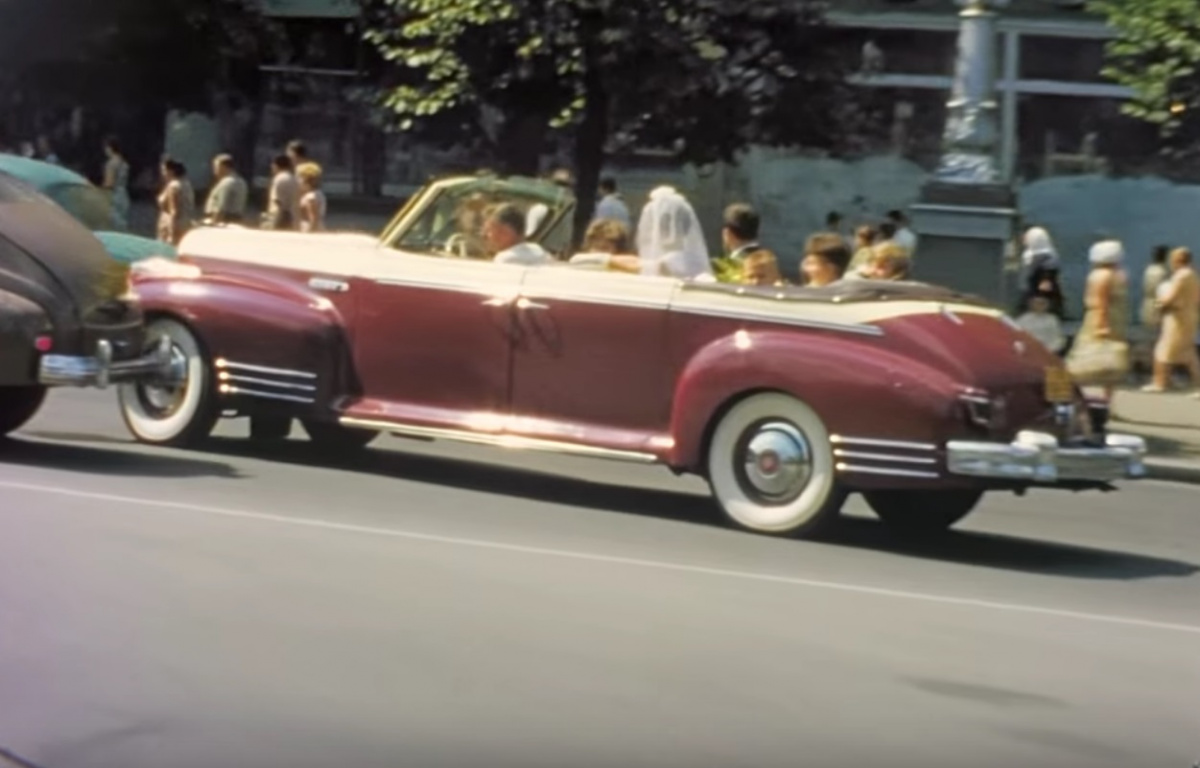 Цветную кинохронику с центральной улицы Киева – Крещатика, датированную летом 1967 года, открывает свадебный автомобиль. Это роскошный кабриолет ЗИС-110В, в интересной кремово-вишневой раскраске. Далее мы видим автобусы ЛАЗ, троллейбус киевского производства КТБ, грузовой фургон Москвич-424.