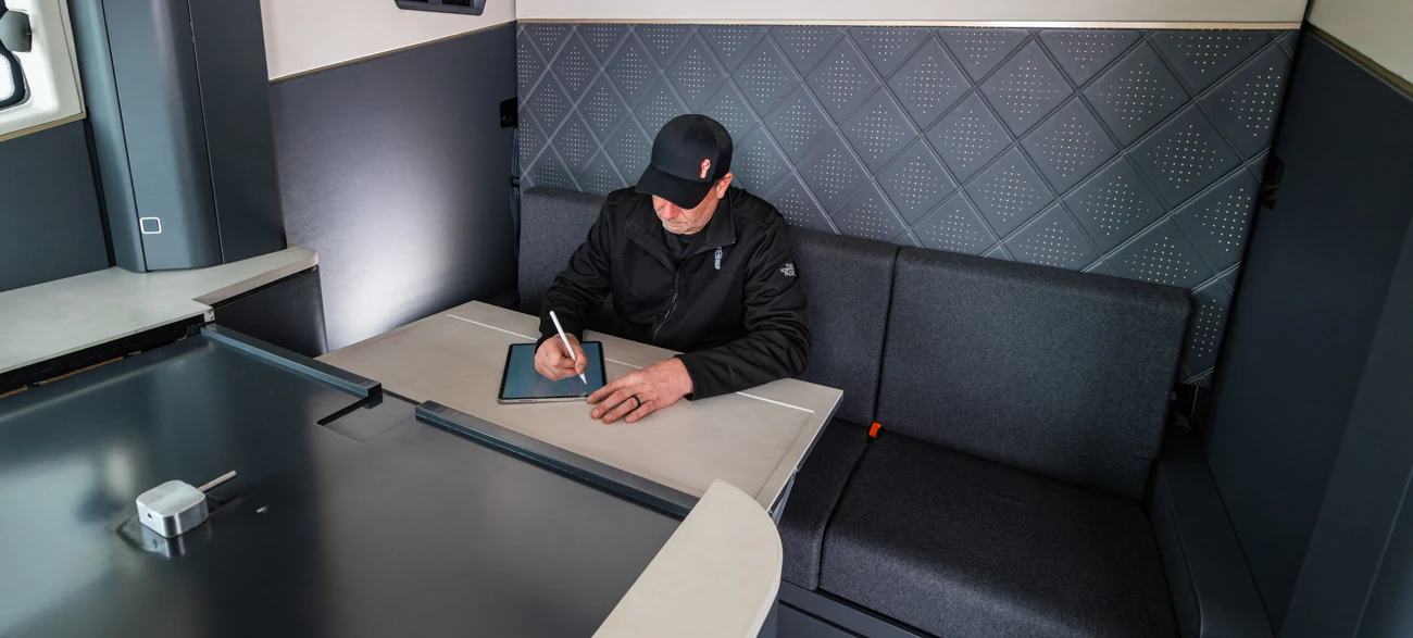 Отдельно нужно отметить передовую конструкцию кабины – с центральным расположением места водителя и новым спальником. Дизайном машина напоминает скоростной поезд.