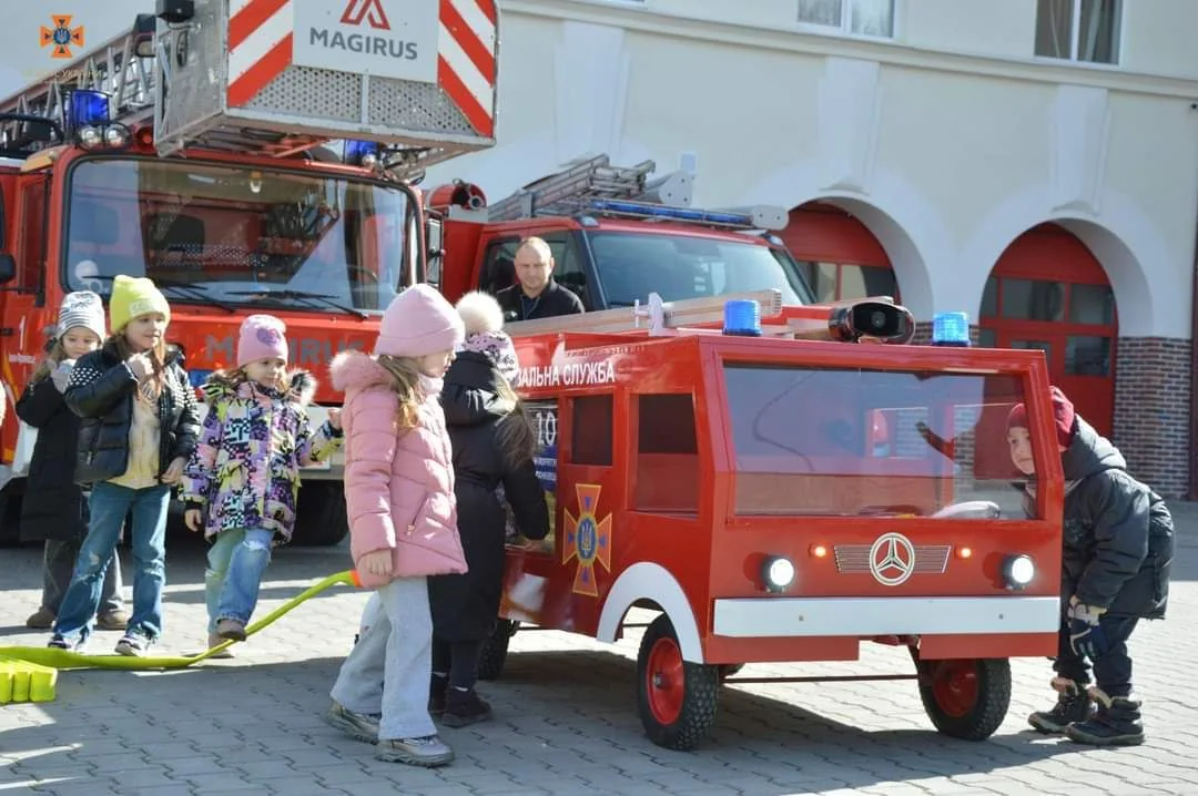 В одній із пожежних частин Івано-Франківщини збудували унікальний автомобіль, який не має аналогів в Україні. Це зменшена копія справжнього, проте створена спеціально для дітей. Машина має те саме забарвлення, робочі проблискові маячки, оснащена рацією. Більше того, в ній відтворено відсіки з ролетними дверима, за якими знаходяться пожежні рукави. Все це має показати дітлахам у наочній формі як гасять пожежі, а також навчити їх як треба діяти у надзвичайних ситуаціях.