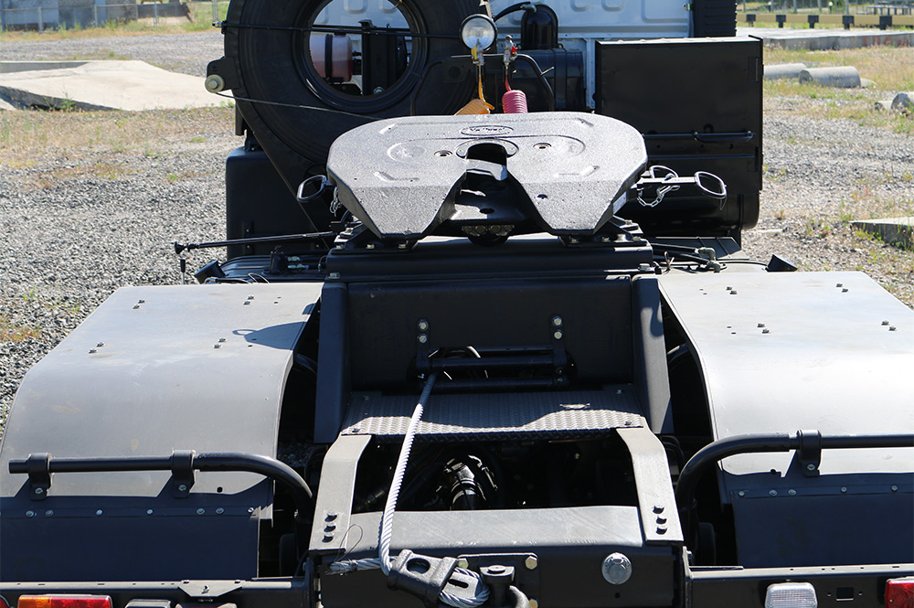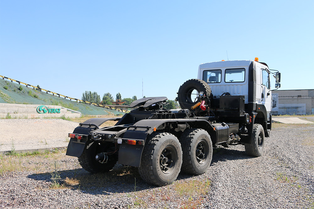 Новый седельный тягач КрАЗ-6510ТЕ (6х6) изготовлен с техническими требованиями заказчика. А они следующие – бескапотная компоновка, кабина с местом для отдыха, дизельный двигатель мощностью 460 л.с. и автоматическая коробка передач. Также машина должна быть оснащена лебедкой с гидроприводом и седельно-сцепным устройством под 3,5-дюймовый шкворень.