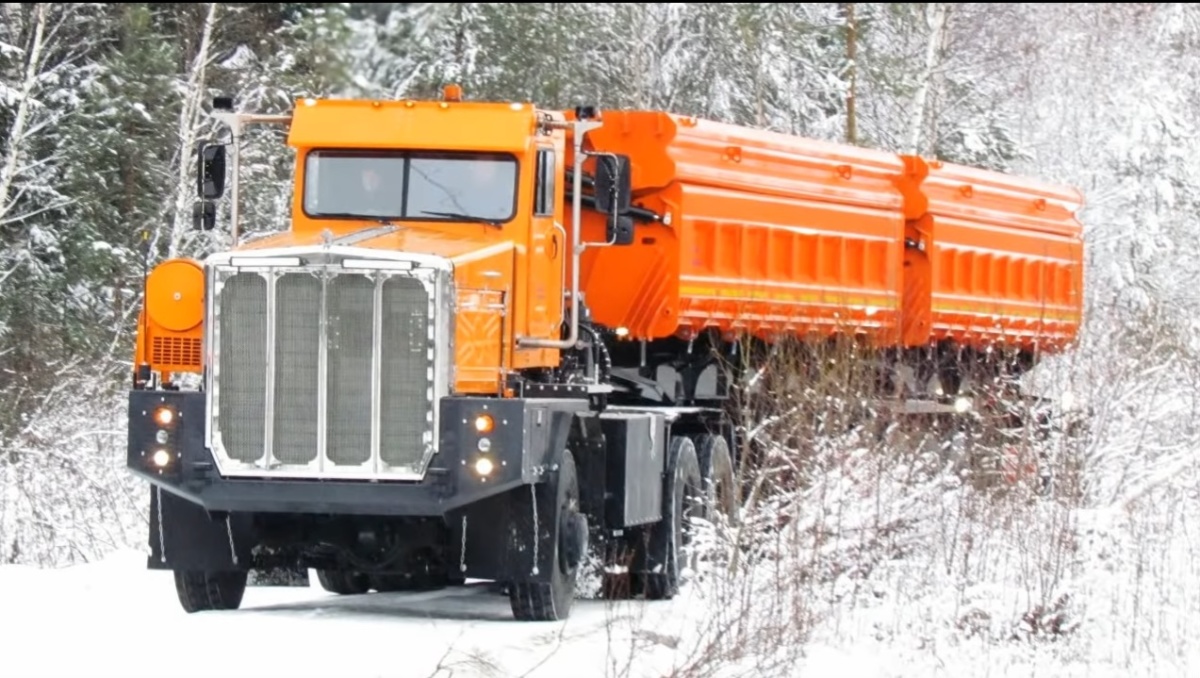 На рамах обоих полуприцепов установлен разгружаемый набок самосвальный кузов длиной 9,4 м каждый. Больше нельзя, из-за ограничения длины приемного устройства на перерабатывающем заводе. Емкость кузова – 38 м куб. То есть общая вместимость двух полуприцепов – 76 м куб. При габаритной длине почти 29 м радиус разворота автопоезда гиганта всего 14,5 м. Хотя можно развернуться и на меньшем пятачке – в два приема, немного сдав назад на тягаче, полуприцепы при этом неподвижные. Максимальная скорость движения с грузом – 45 км/ч, а порожняком – на 20 км/ч больше.