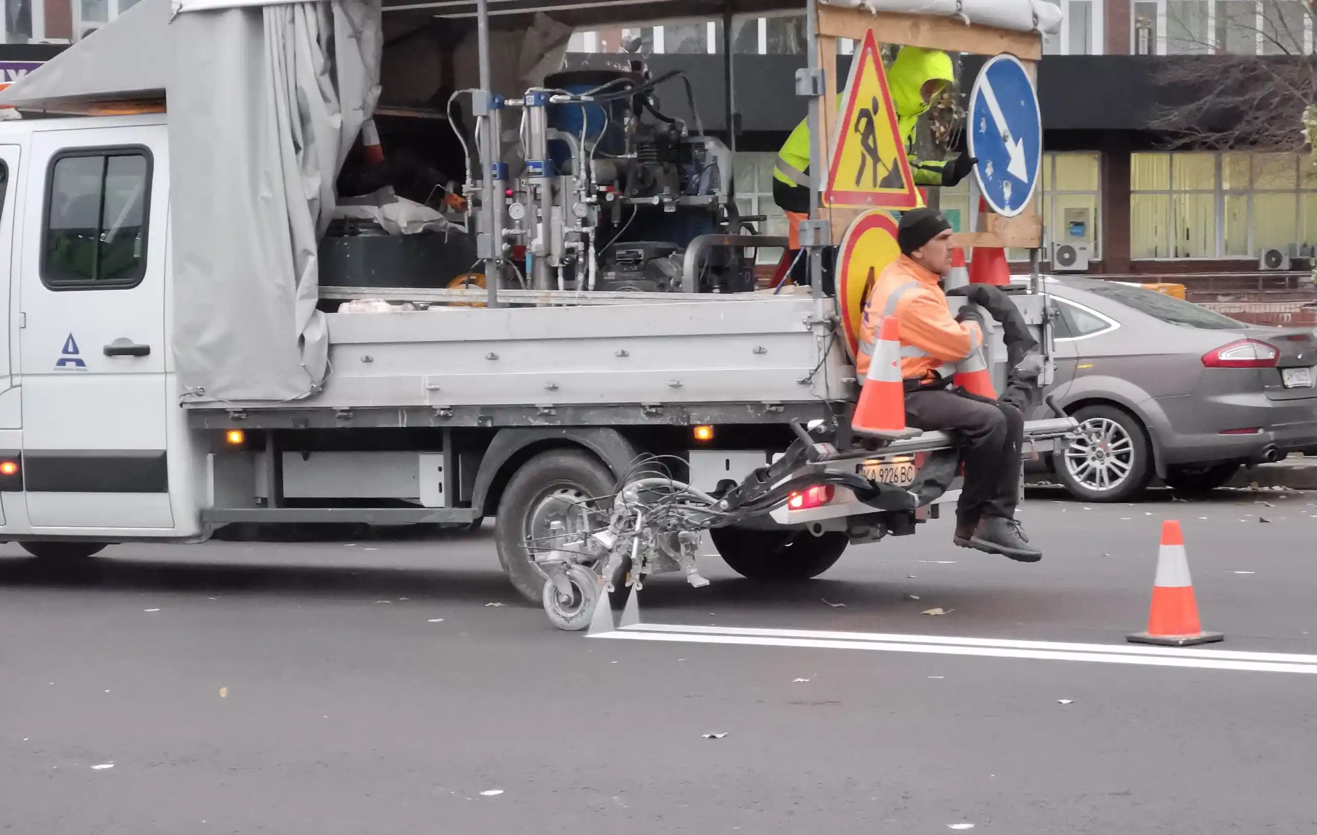 На его бортовой платформе было установлено необходимое оборудование для такого вида работ. Интересно, что на переднем бампере машины прикрепили рампу с вертикальной жердочкой с левой стороны, что-то вроде прицела. Во время работы движение по улице не перекрывали, а просто помечали конусами свежевыкрашенные участки, дабы на них не заезжали колесами.