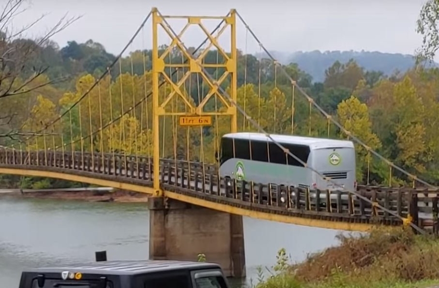 В США в штате Арканзас на днях было зафиксировано очень грубое нарушения правил проезда по мосту. Водитель большого туристического автобуса хладнокровно проигнорировал знак ограничения нагрузки, который стоял у подвесного моста Бивер-Бридж.