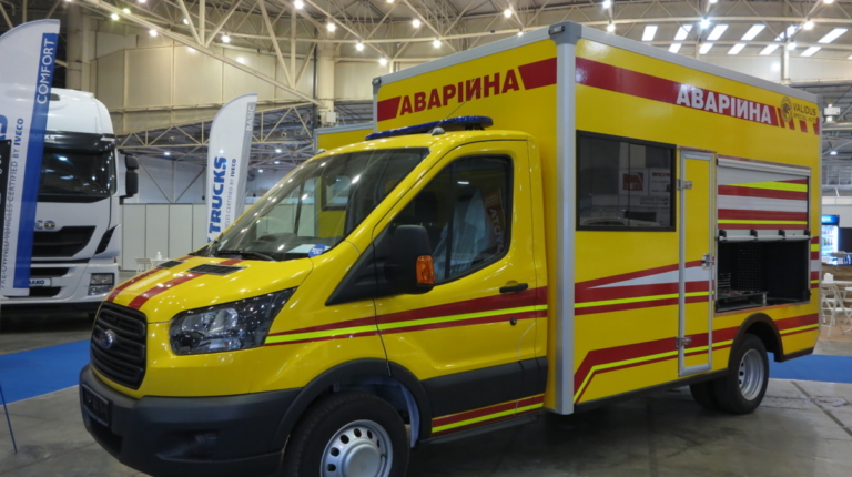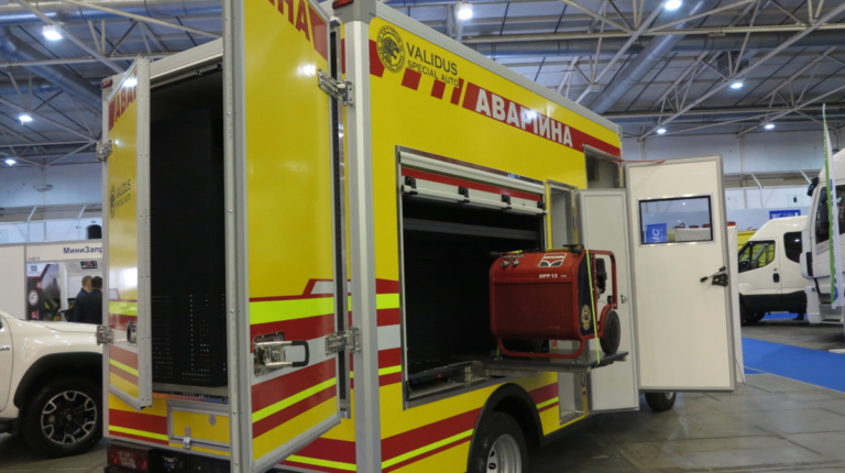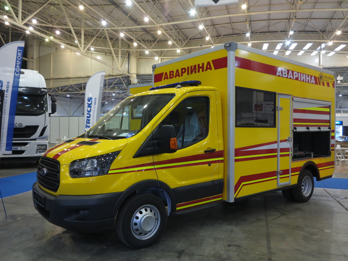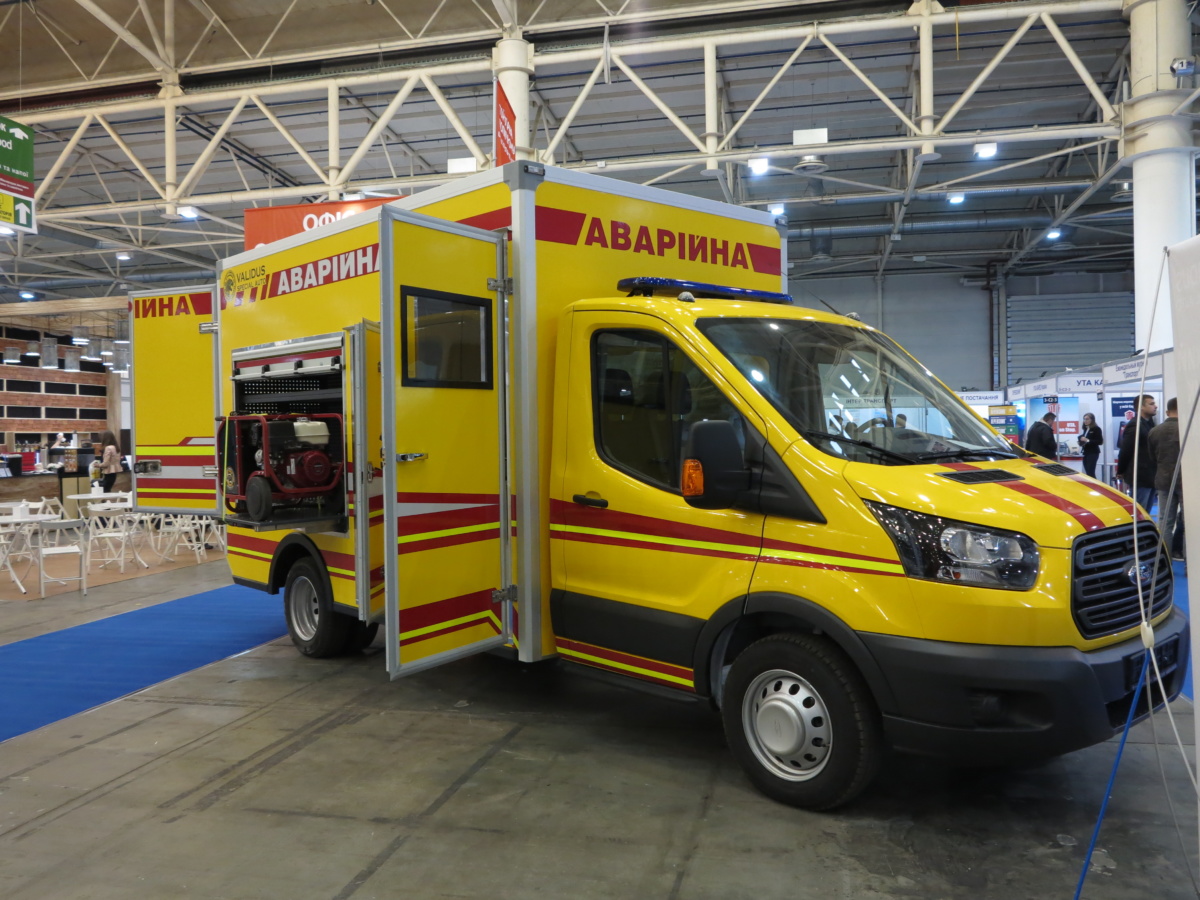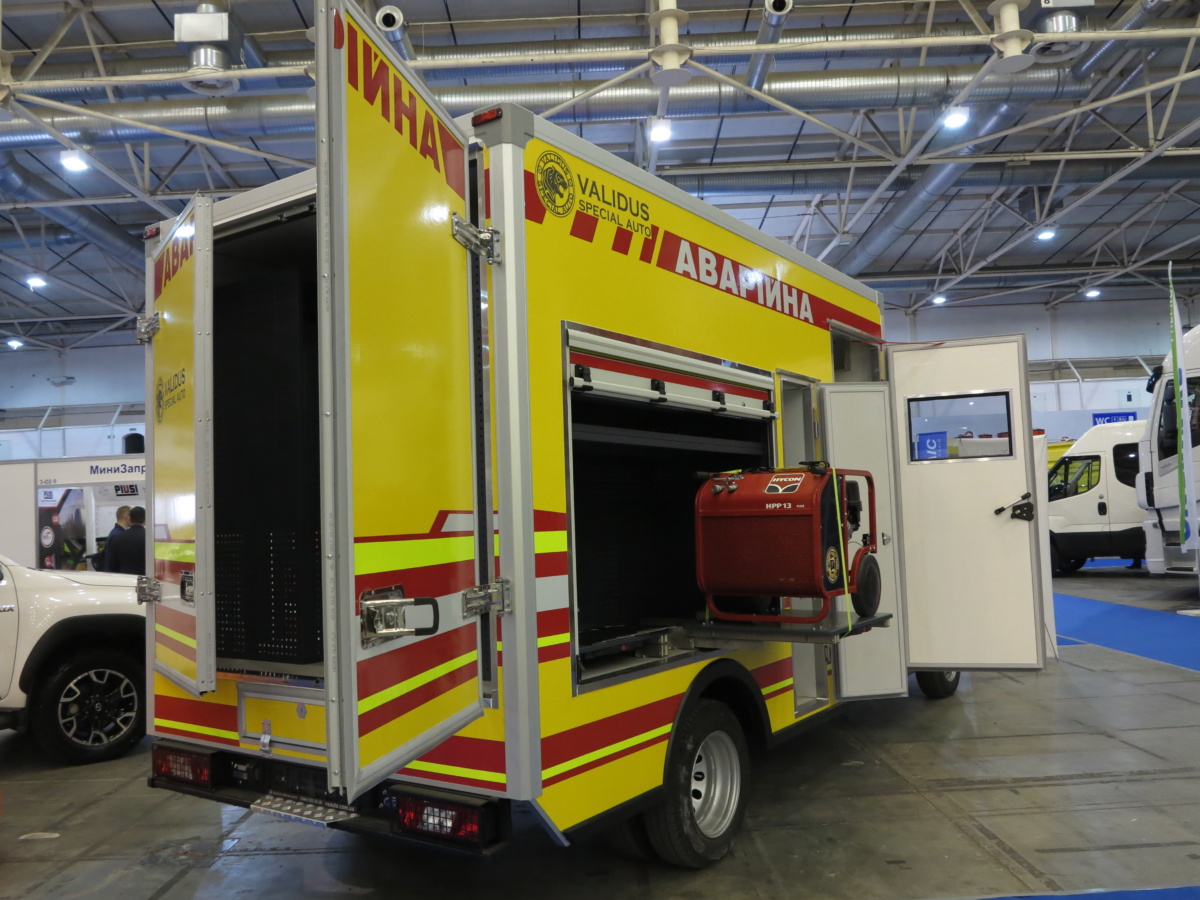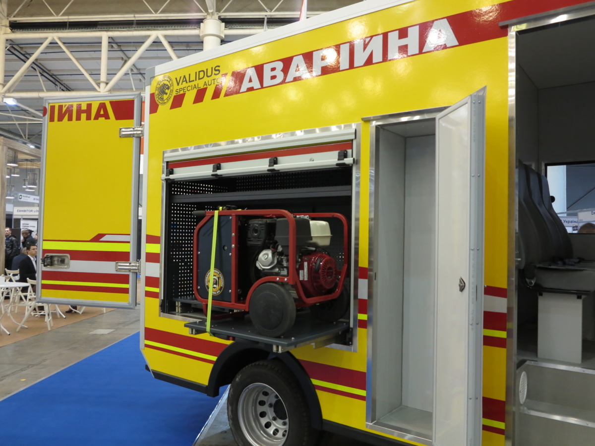 Киевская компания «Валидус СпецАвто» (Validus Special Auto) экспонирует автомобиль аварийно-ремонтных и восстановительных работ на шасси Ford Transit. Из спецоборудования – переносная дизель-генераторная установка.