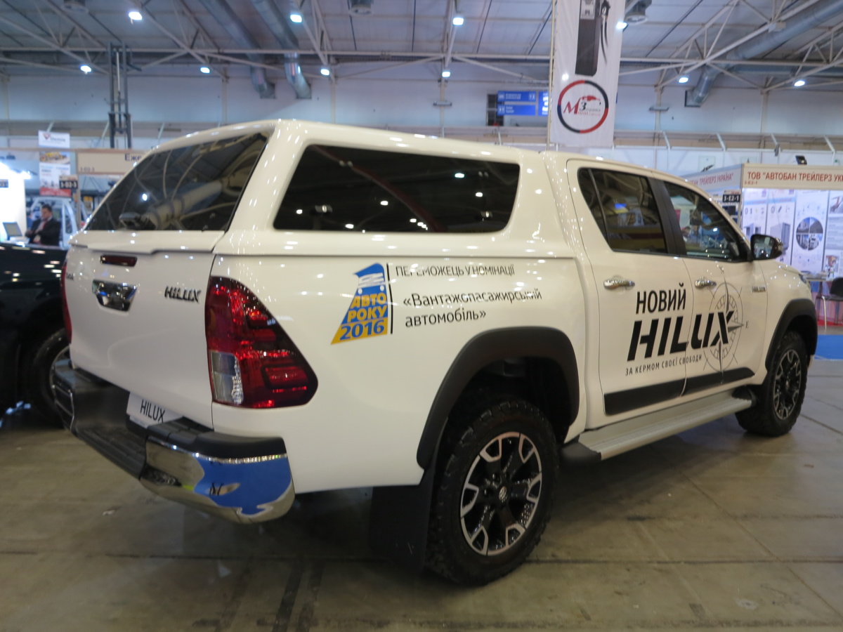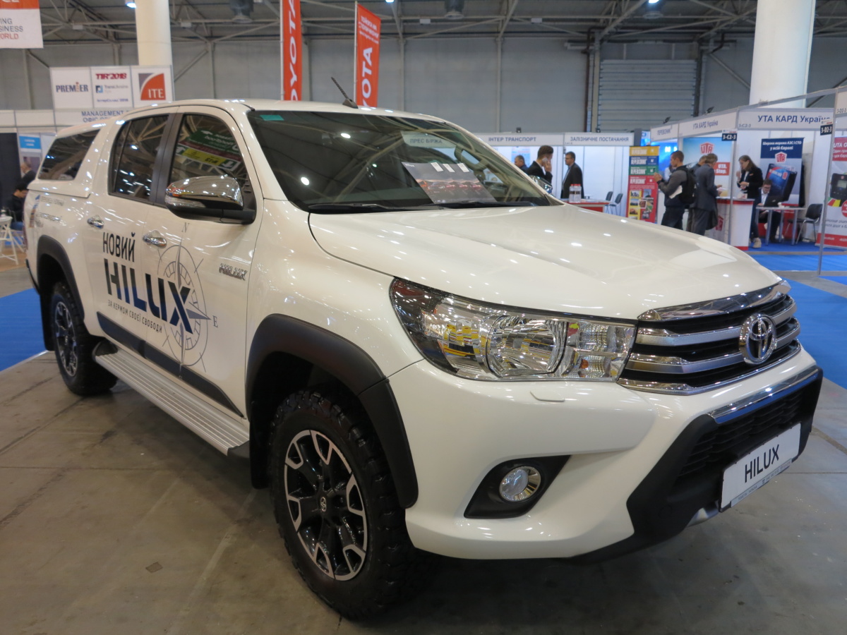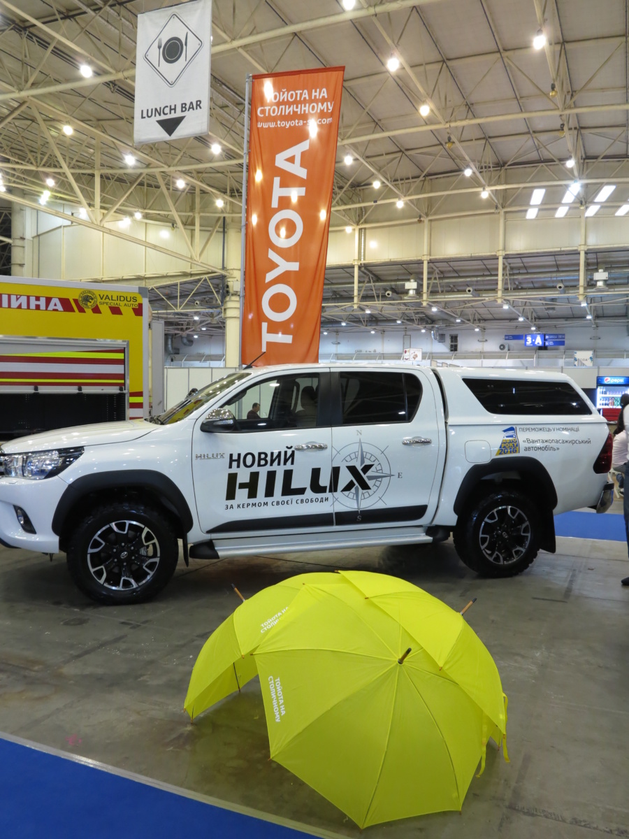 Интересный стенд и у Toyota. Тут в частности представлен пикап Toyota Hilux, который предлагается на украинском рынке с двумя турбодизелями на выбор: 2,4 л мощностью 150 л.с. и 2,8 л в 177 л.с. Коробка передач – 6-ступенчатая, механическая либо автоматическая. Доступны три комплектации: Business, Active и Legend.