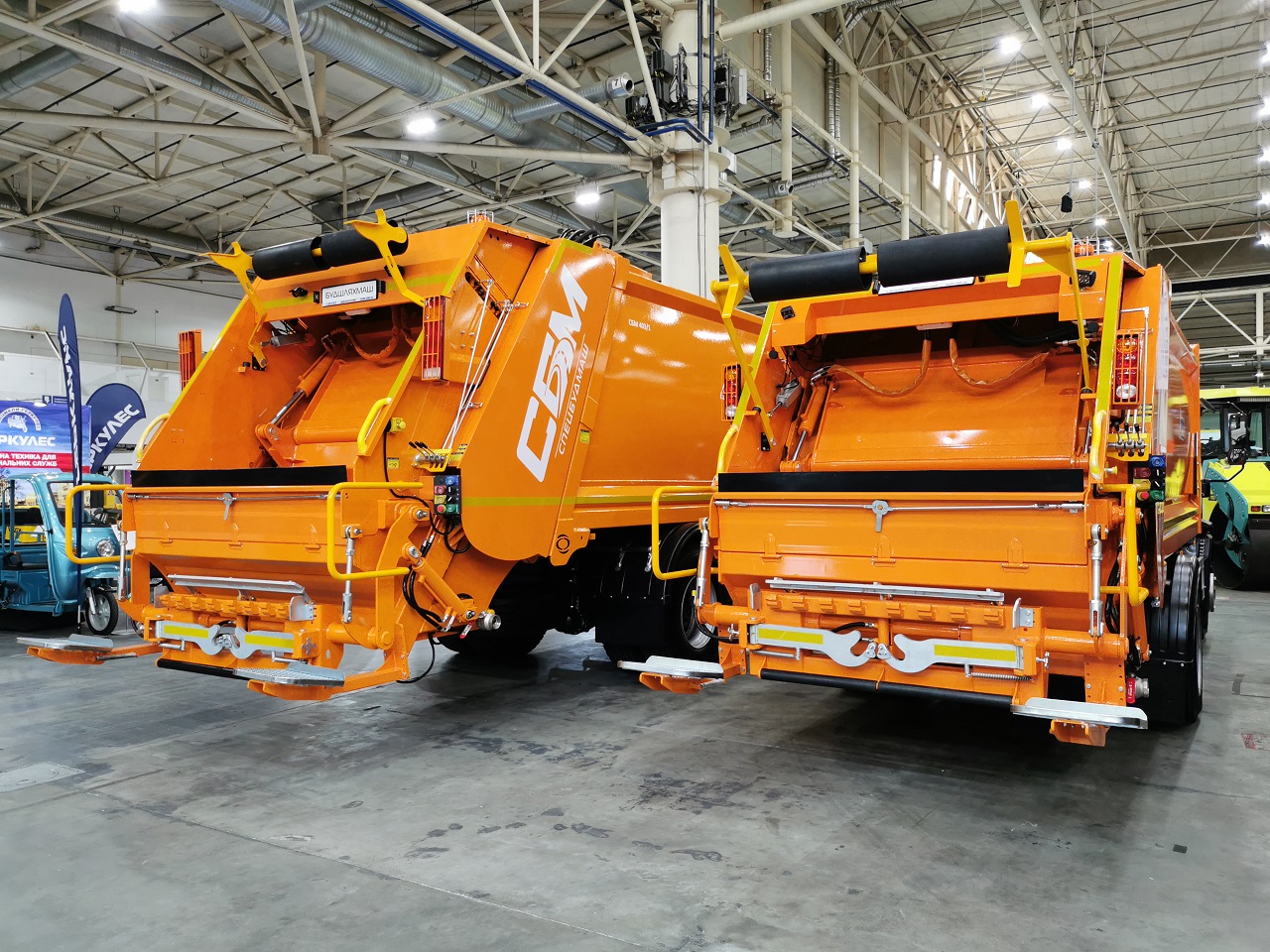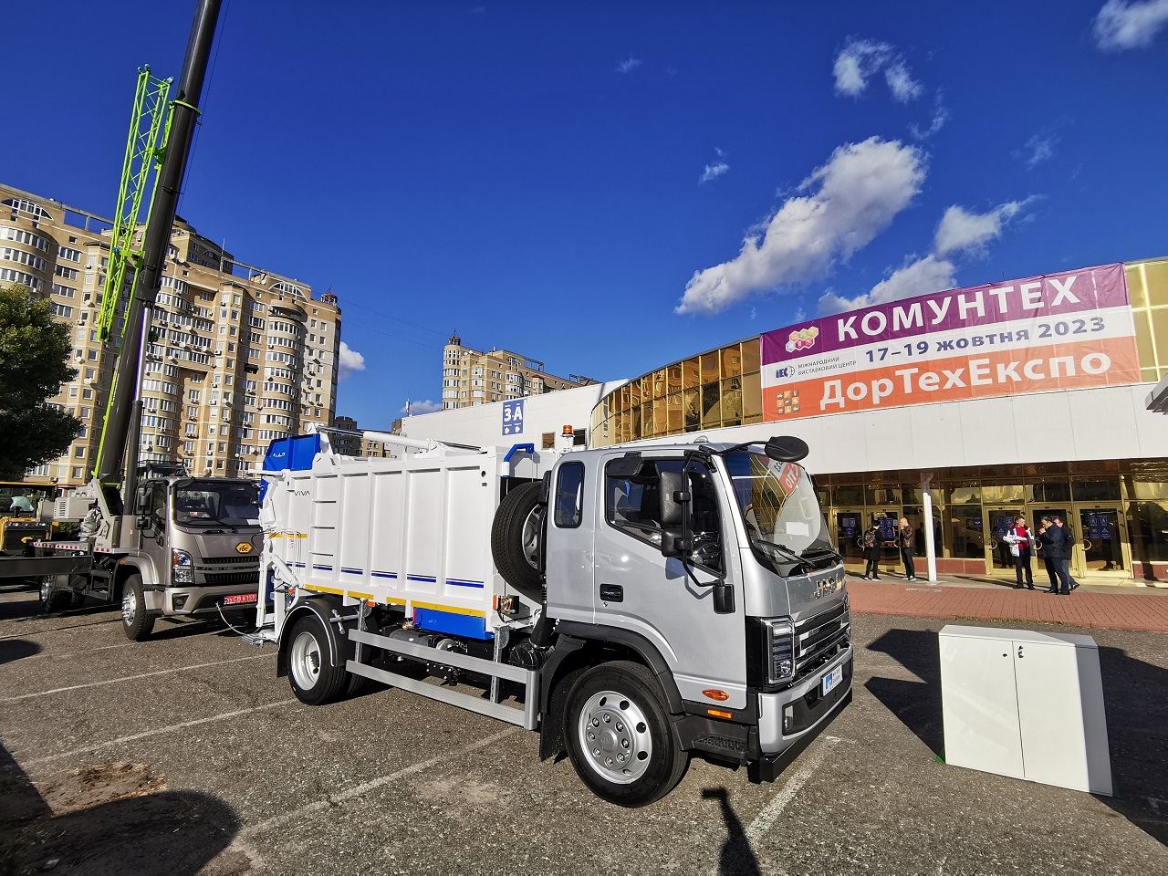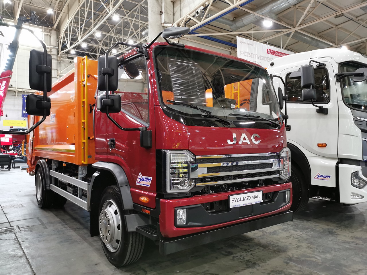 Также показана и обновленная модель JAC N120, причем в двух исполнениях: 10-кубового мусоровоза задней загрузки CБМ-401/1 на 3795 кг отходов, а также шасси с системой сменных кузовов СБМ-401/3.
