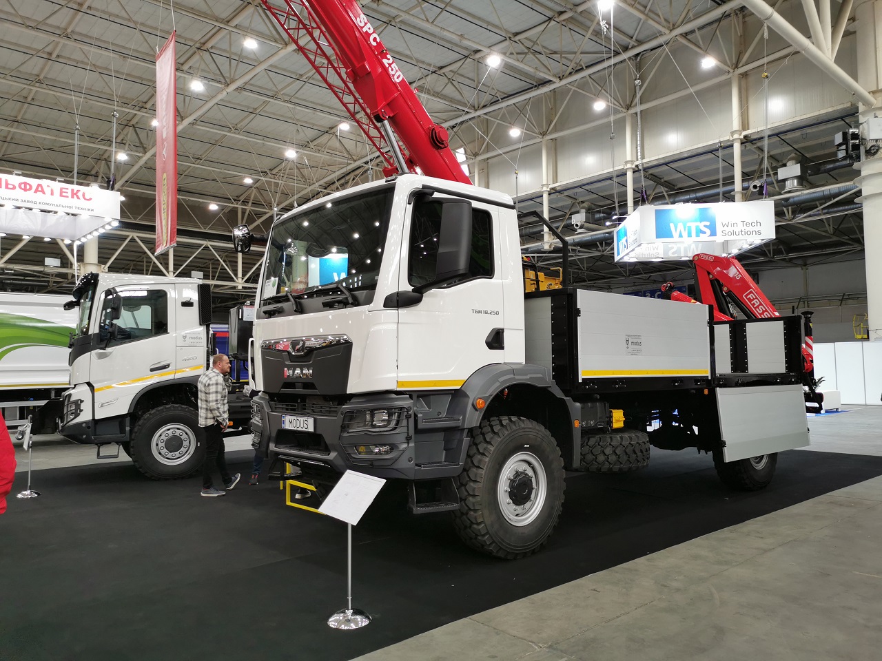 На стенде MODUS также можно увидеть бортовой специализированный автомобиль MAN TGM18.250 (4х4), оснащенный краном-манипулятором Fassi F115F.0.22. Его максимальный грузовой момент – 11,11 тм. Максимальный вылет – 7,9 м. Грузоподъемность на максимальном вылете – 1360 кг, а на минимальном (2,15 м) составляет 5400 кг.