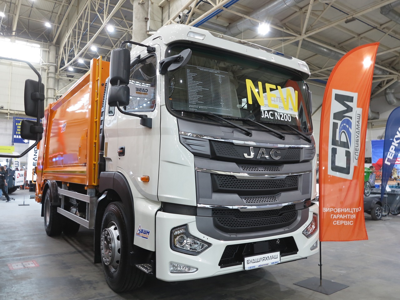 На стенде компании «Будшляхмаш» можно увидеть грузовики JAC с обновленными кабинами. Начнем с модели N200, которая представлена в качестве мусоровоза задней разгрузки. Здесь смонтирован 16-кубовый бункер, который рассчитан на 8277 кг отходов. Коэффициент прессования – 6:1. Грузоподъемность манипулятора – 700 кг. Полная масса – 19980 кг. Двигатель Сummіns рабочим объемом 6,7 л и мощностью 277 л. с.