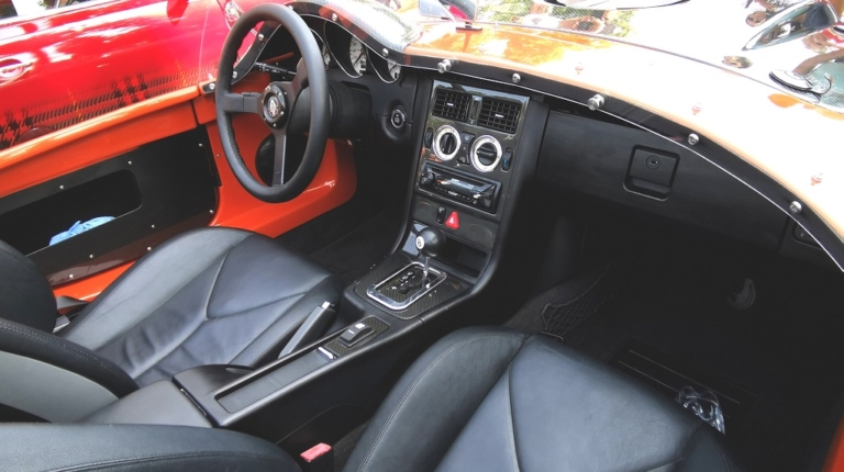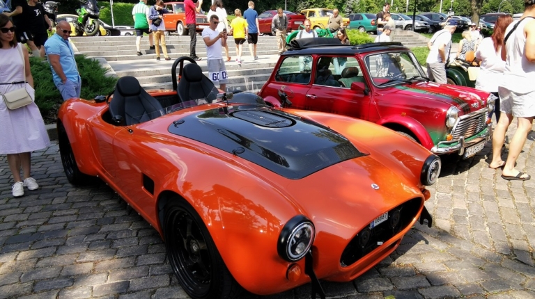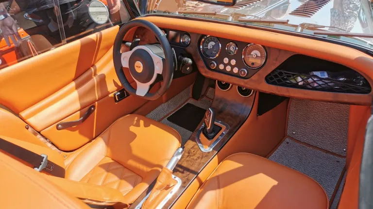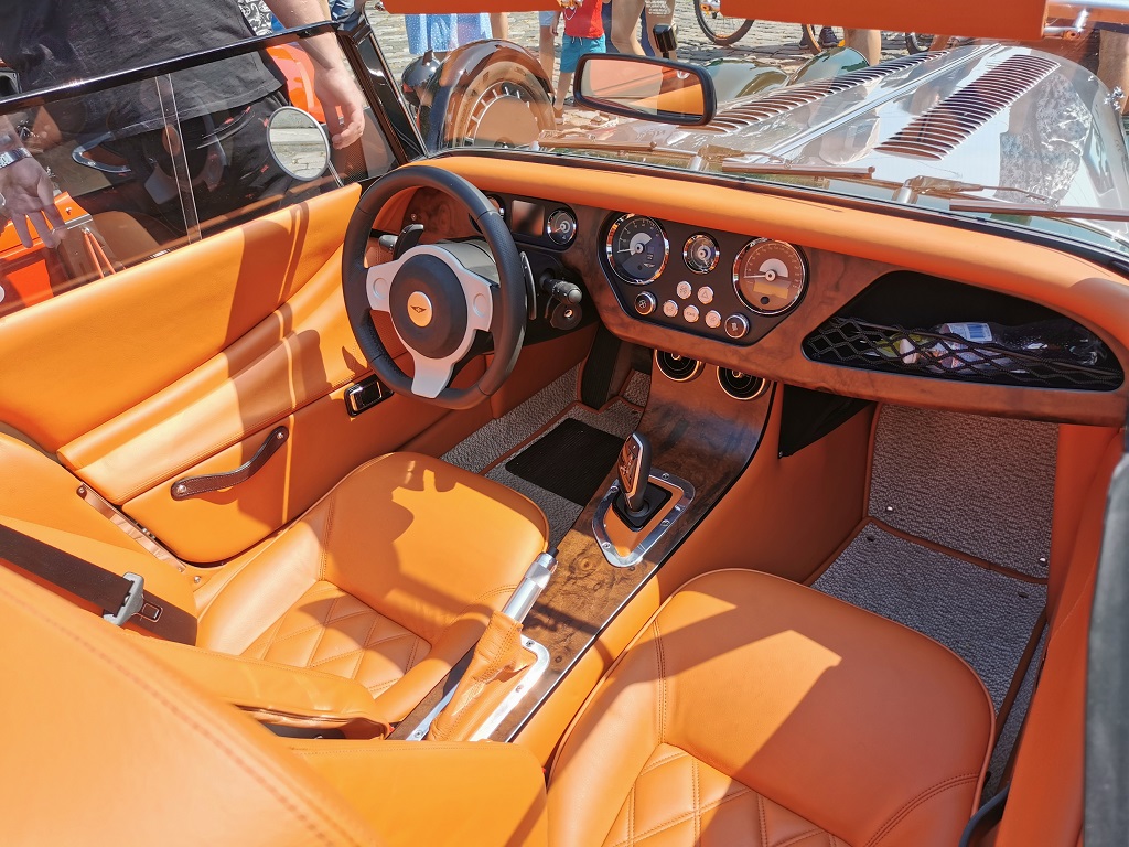 Вторая модель – Plus Four, изготовленная в 2021 году, имеет уже привычные четыре колеса и по дизайну напоминает легендарную модель 50-х гг. Она построена на алюминиевом, клееном шасси и деревянной раме. Под капотом установлен двухлитровый турбомотор BMW в 259 «лощадок». Также на выставке была представлена и реплика известного спорткара AC Cobra.