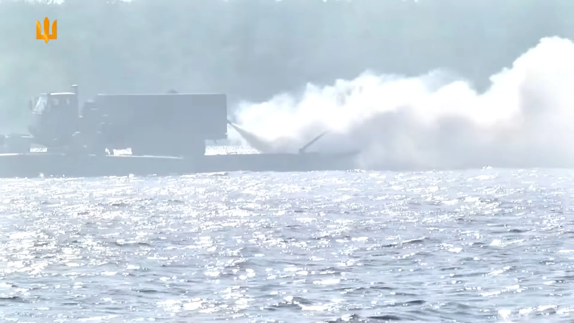 В данном случае переправляли армейские автомобили КрАЗ, которые и доставили вышеуказанные понтоны и катера. Более того, на пароме были задействованы дымовые машины, которые позволяют с помощью аэрозольной завесы шириной до 1 км эффективно замаскировать мостовую переправу от противника.