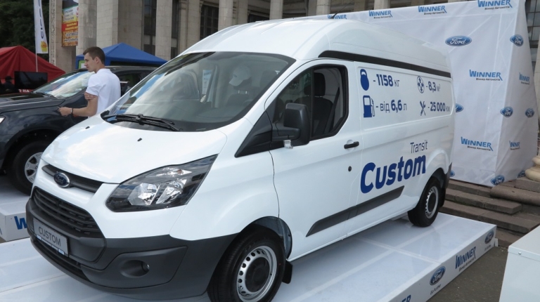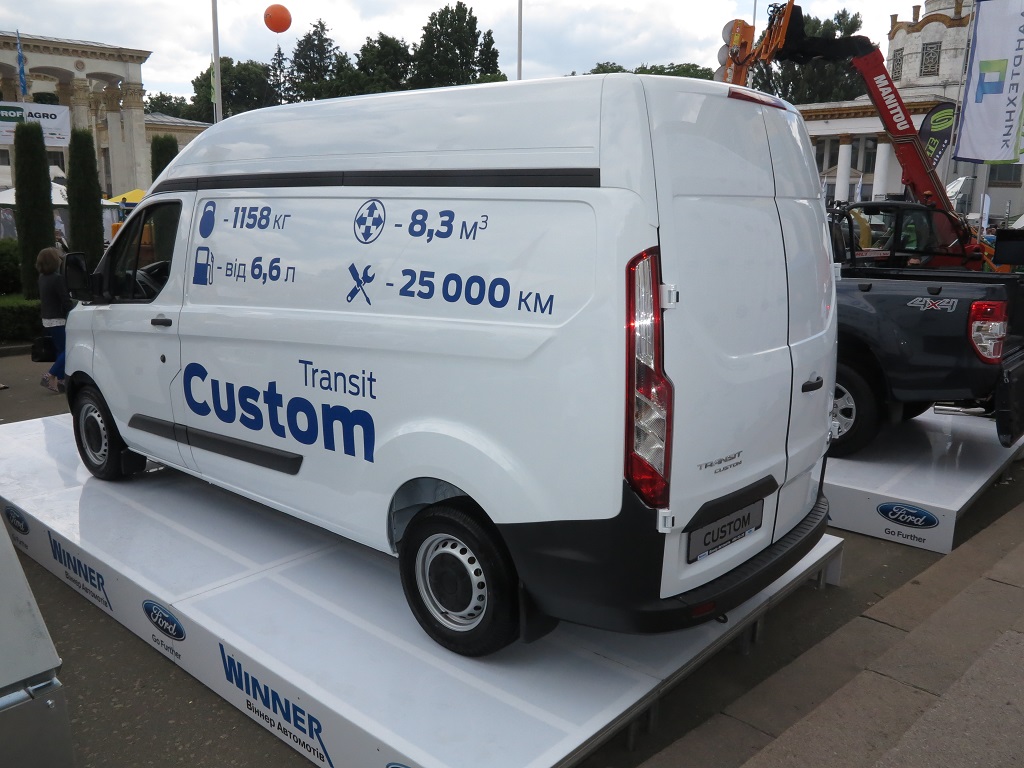 Второй интересной моделью на стенде Ford стал легкий развозной фургон Transit Custom. Машина представлена в длиннобазном исполнении, с высокой крышей. В итоге грузовой отсек имеет полезную вместимость 8,3 кубометра. Грузоподъемность автомобиля составляет 1193 кг.