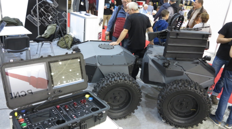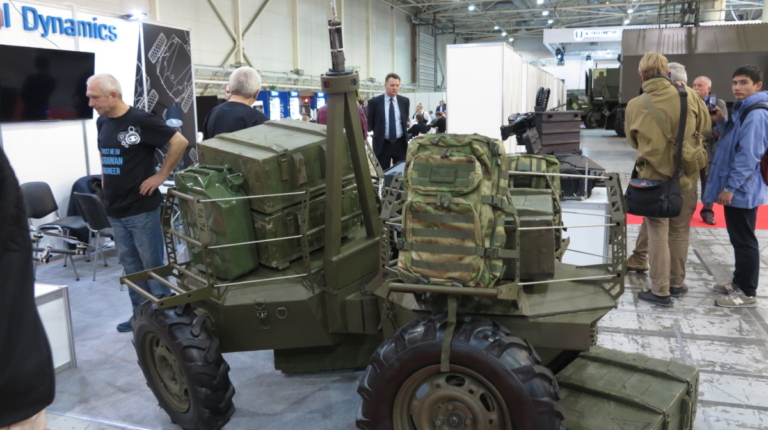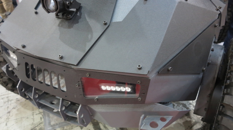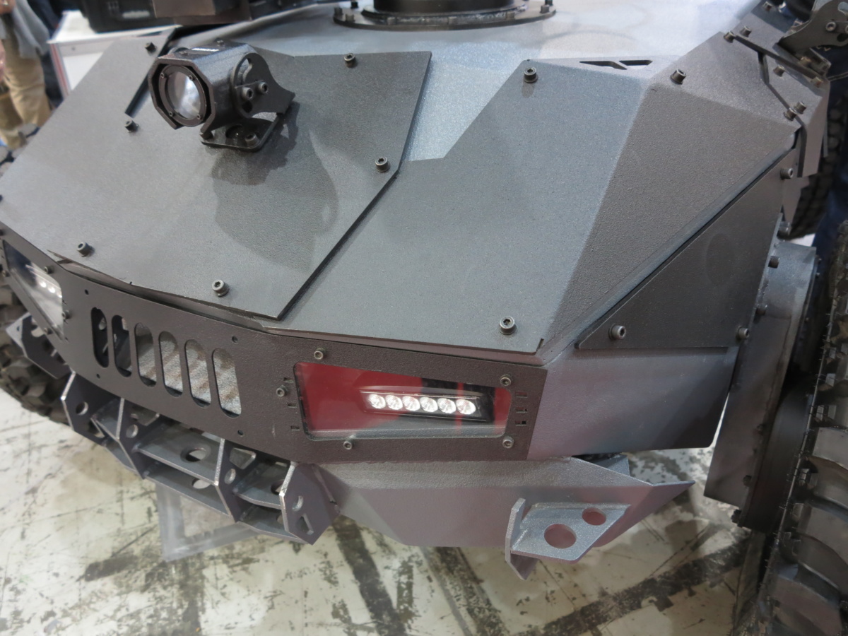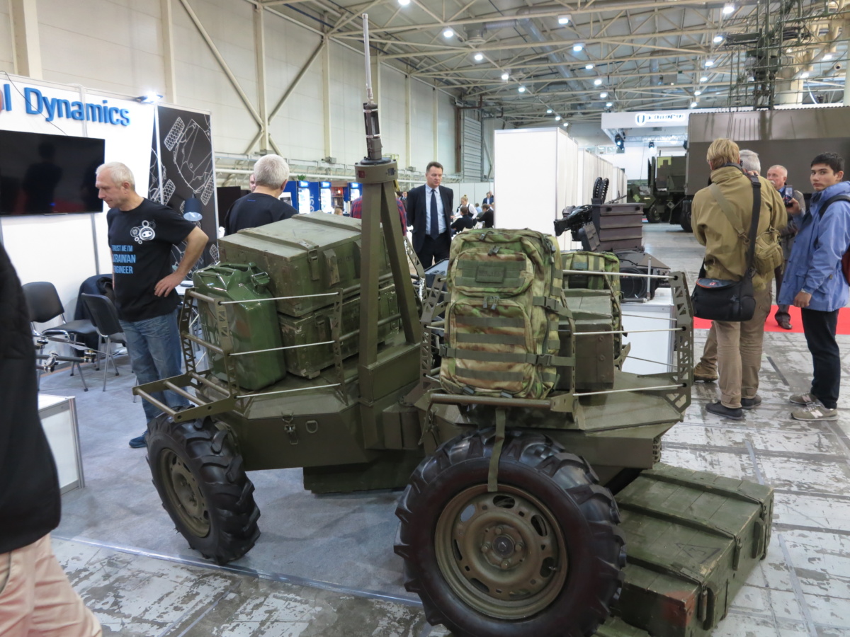 Очень интересные роботы показала компания Global Dynamics из Львова. На стенде можно увидеть сразу две единицы дистанционно управляемого транспорта (ДУТ). Начнем с бронированного ДУТ «Ironclad». Он имеет шарнирно-сочлененную раму, полный привод и имеет модульную навесную броню 4-класса (защита от пуль 12,7 мм).