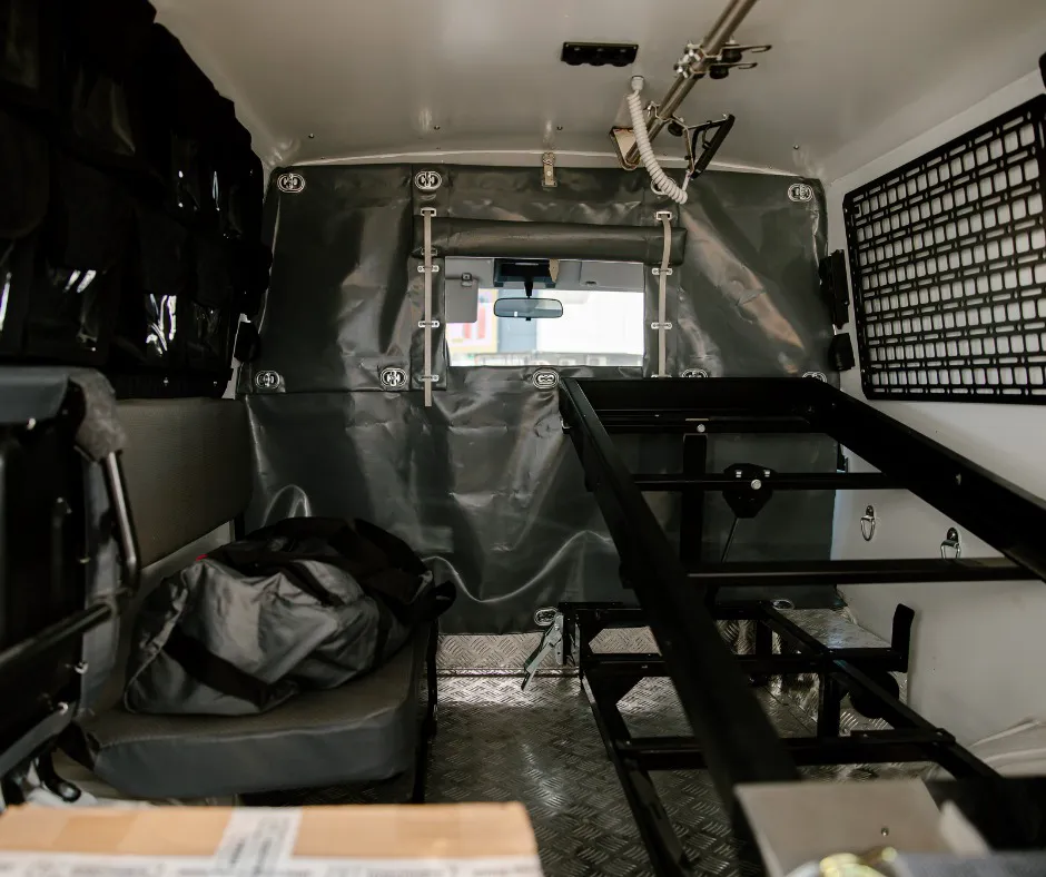 Отметим, что Toyota Land Cruiser 78 оснащается трехдверным кузовом. В данном случае салон автомобиля оборудован для перевозки раненных бойцов – одного лежащего на носилках и четырех в положении сидя на откидных сиденьях слева по борту. Немаловажно, что в оснащение входит РЄБ.