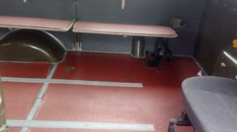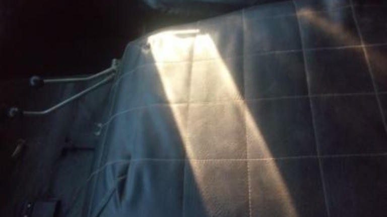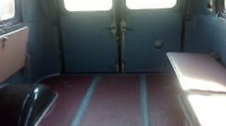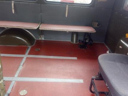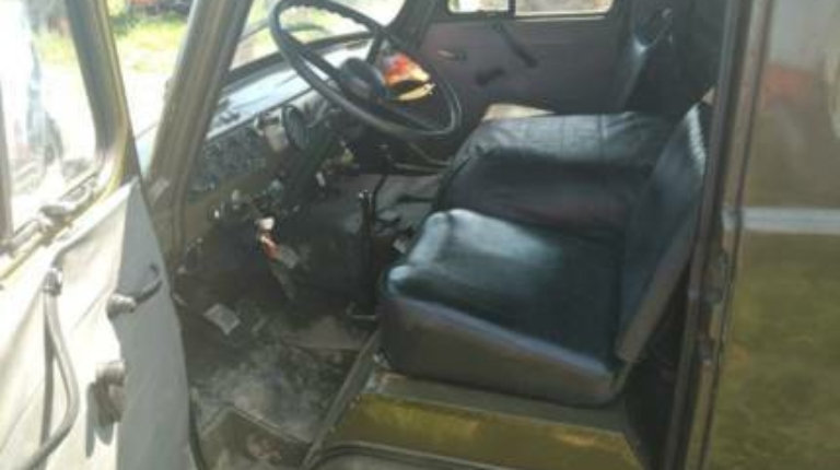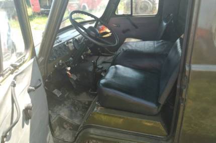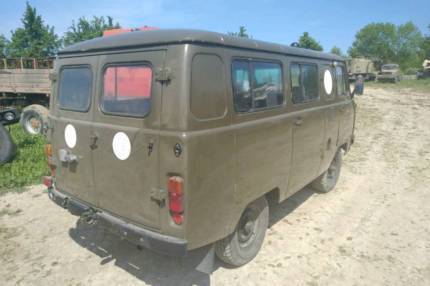 Скорее всего дизель установили на «буханку» позднее. Первоначально военный УАЗ-452 использовался в качестве санитарного автомобиля, о чем свидетельствуют белые кругляши за передними дверьми, на которых в свое время были красные кресты. Внутри на боковинах также можно заметить крепежные элементы под носилки.