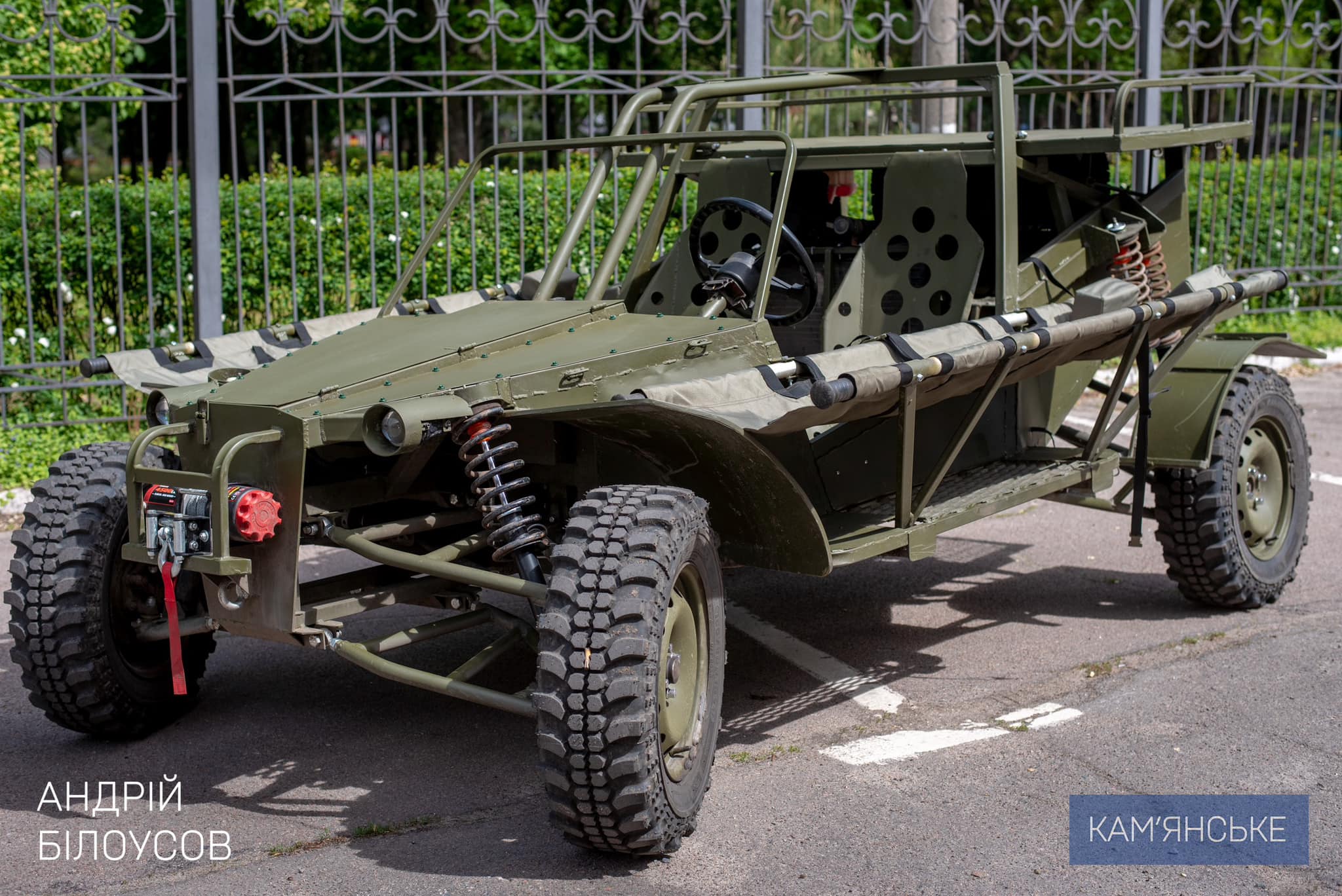 Багги из Каменского отличается крепкой ходовой, о чем свидетельствует подвеска колес, имеющая сзади сдвоенные пружины и амортизаторы. Машина получила мощный трубчатый каркас, а также довольно вместительную багажную площадку в задней части. Слева и справа по борту расположены складные носилки для транспортировки раненных бойцов. На бездорожье придет на выручку установленная электрическая лебедка самовытаскивания.