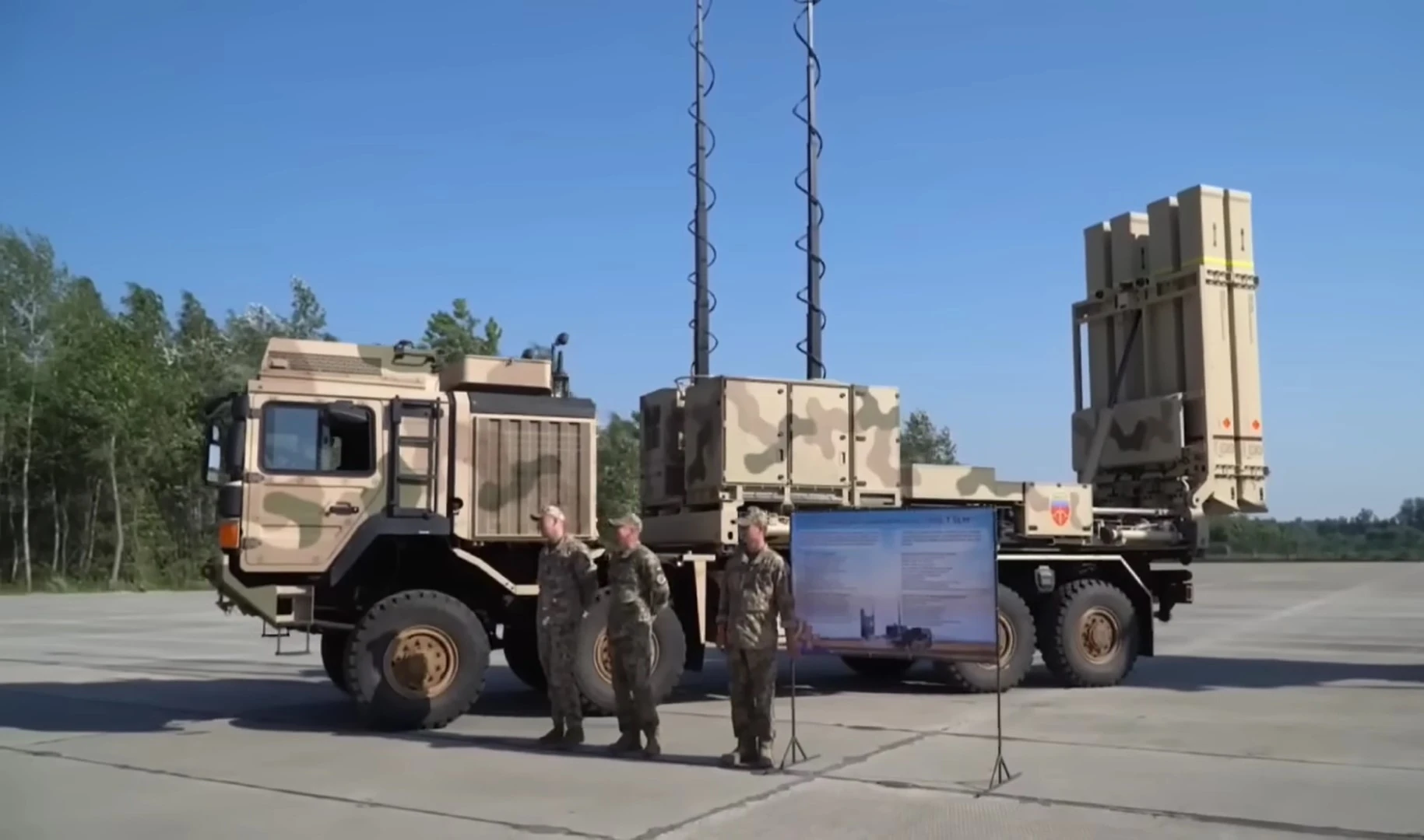 Также Владимиру Зеленскому продемонстрировали передовые образцы вооружения, которые в настоящее время несут службу в воздушных войсках ЗСУ. Это, в частности, ЗРК Patriot на шасси Oshkosh HEMTT и ЗРК Iris-T на базе MAN HX, с помощью которых наших защитники успешно сбивают гиперзвуковые ракеты «Кинжал».