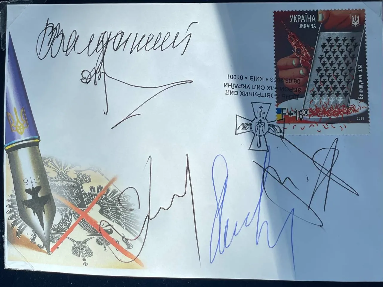 Верховный главнокомандующий также сел в кабину фронтового бомбардировщика Су-24М и оставил автограф на его крылатой ракете Scalp EG, переданной зарубежными партнерами. Президент также принял участие в погашении специальной марки «Укрпочты» ко Дню воздушных сил ЗСУ.