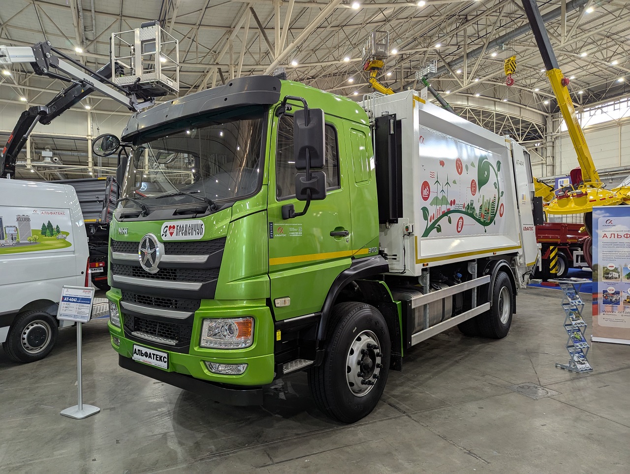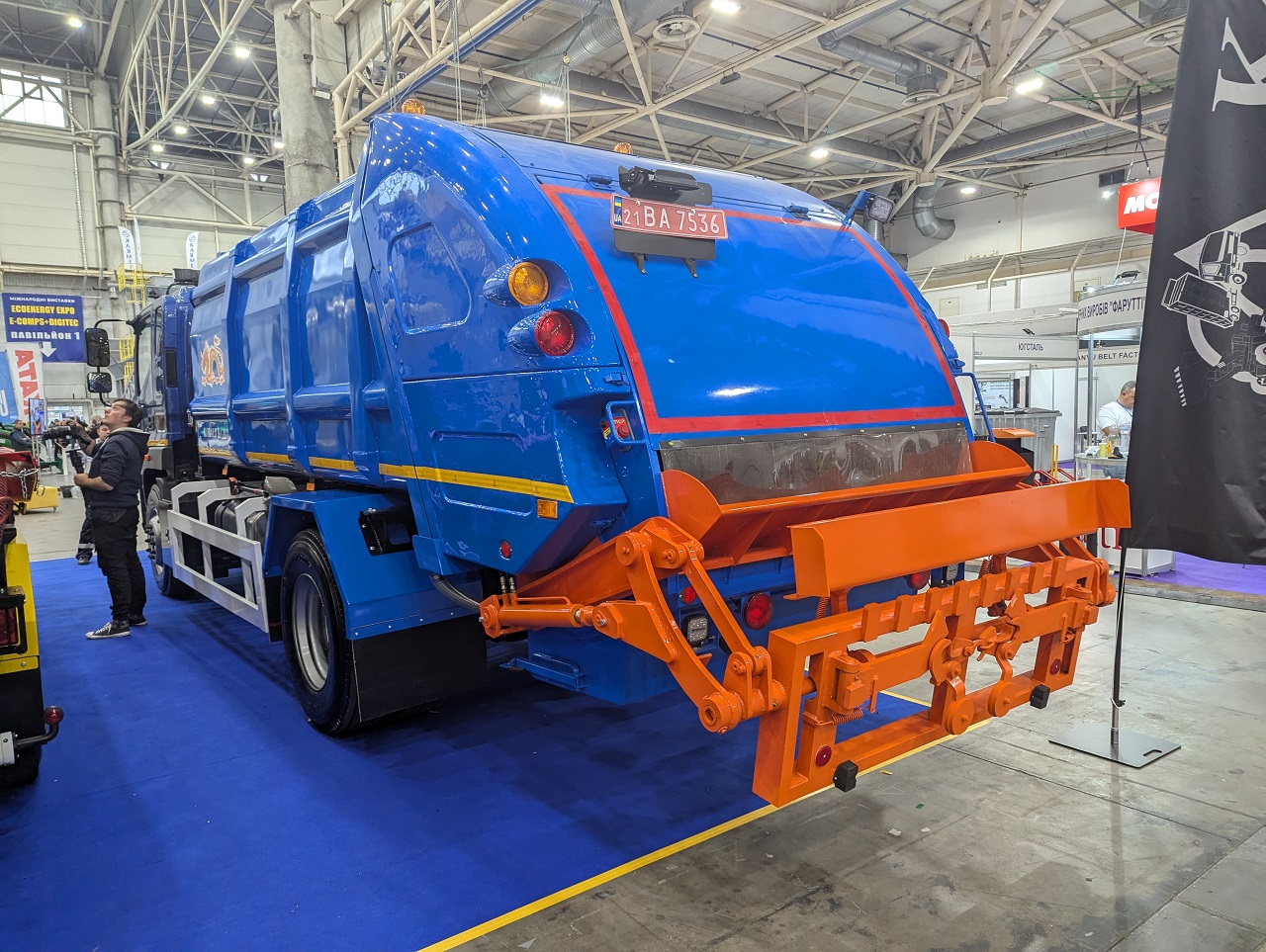 На стенде экспонируется и мусоровоз задней загрузки АТ-4041 на аналогичном шасси. Он имеет объем бункера 16 м куб., коэффициент уплотнения 6:1 и способен перевозить до 8890 кг твердых бытовых отходов.