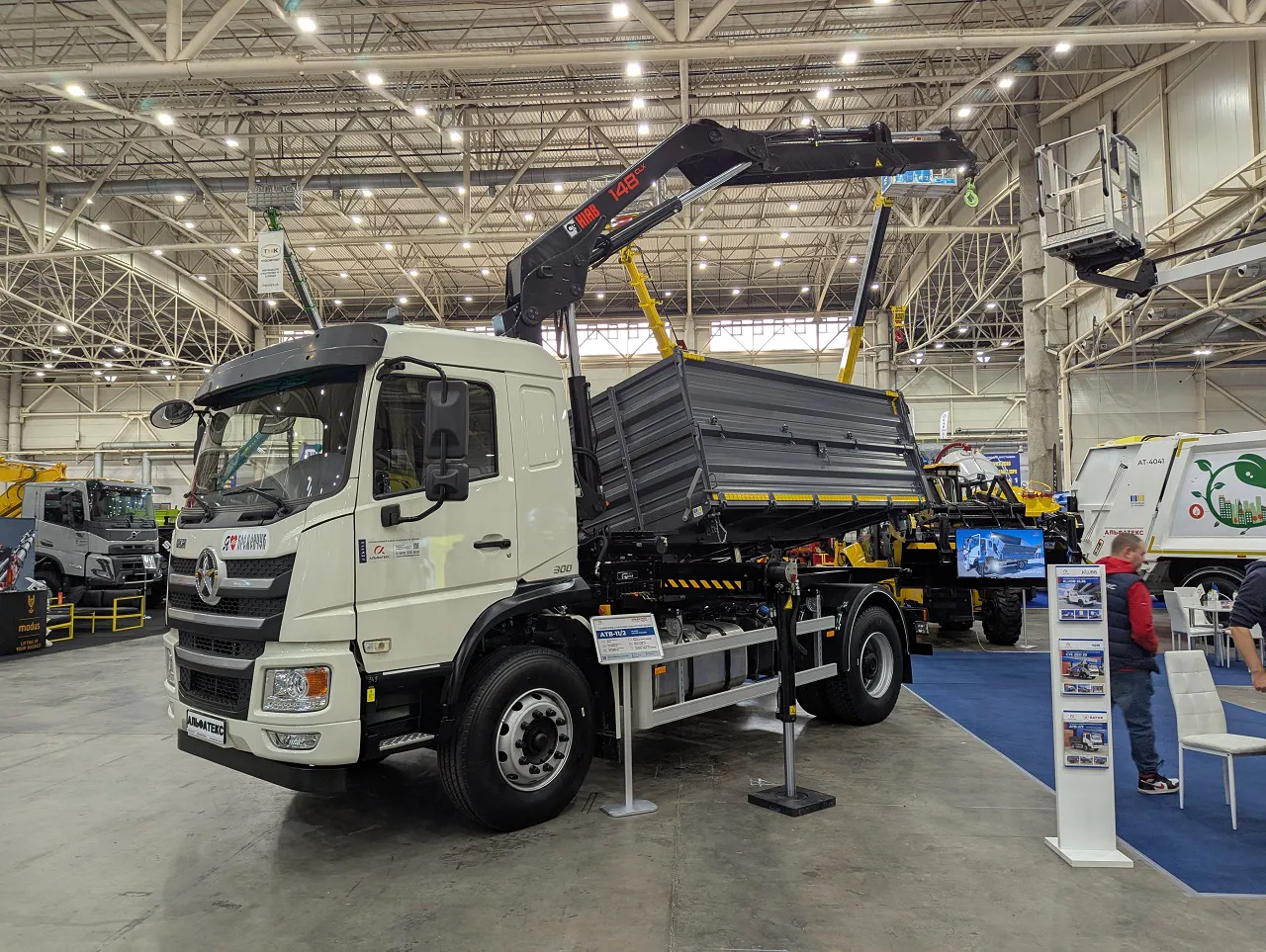 Кременчугский завод коммунальной техники «Альфатекс» привез самосвал трехсторонней разгрузки АТВ-11/2 на шасси Dayun СGC1210 c краном-манипулятором HIAB 148 СLX. Грузоподъемность машины – 12 т, объем кузова – 10 кубометров.