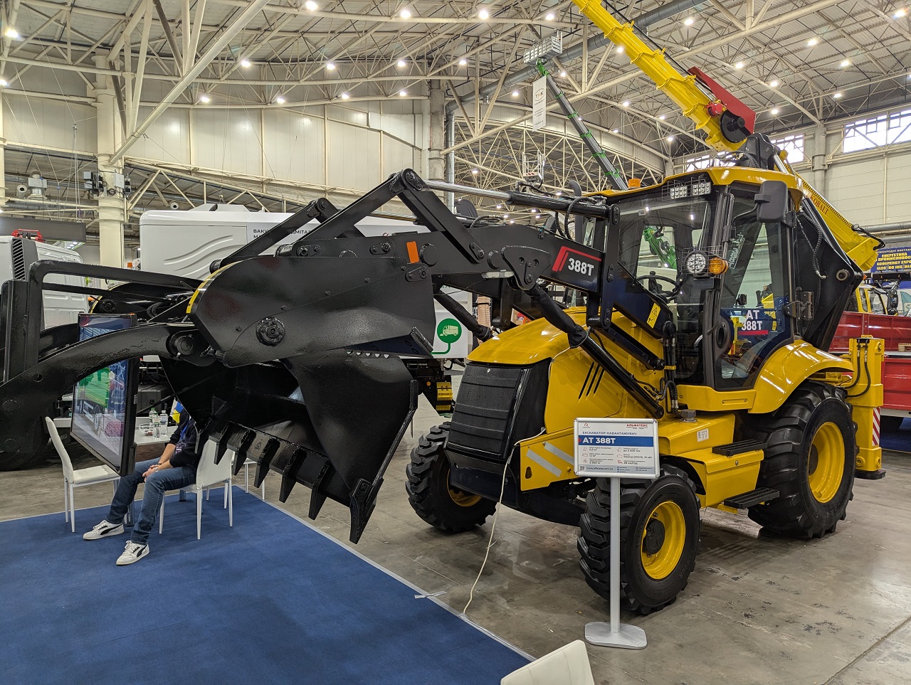 На стенде можно увидеть и экскаватор-погрузчик АТ 388Т – с 1,2-кубовым передним ковшом, грузоподъемностью 2500 кг, а также 0,3-кубовым задним ковшом, с глубиной копания до 5,5 м.