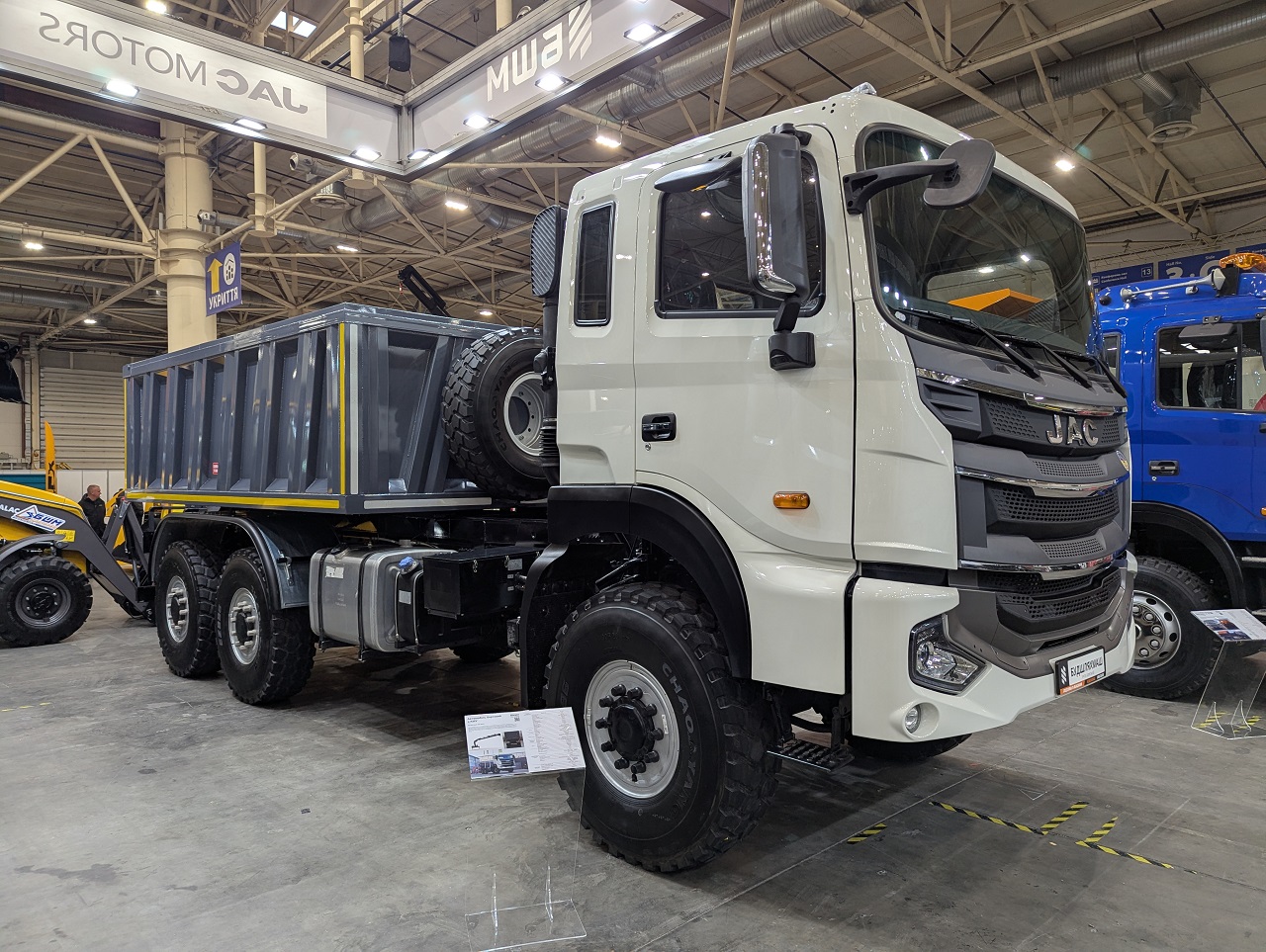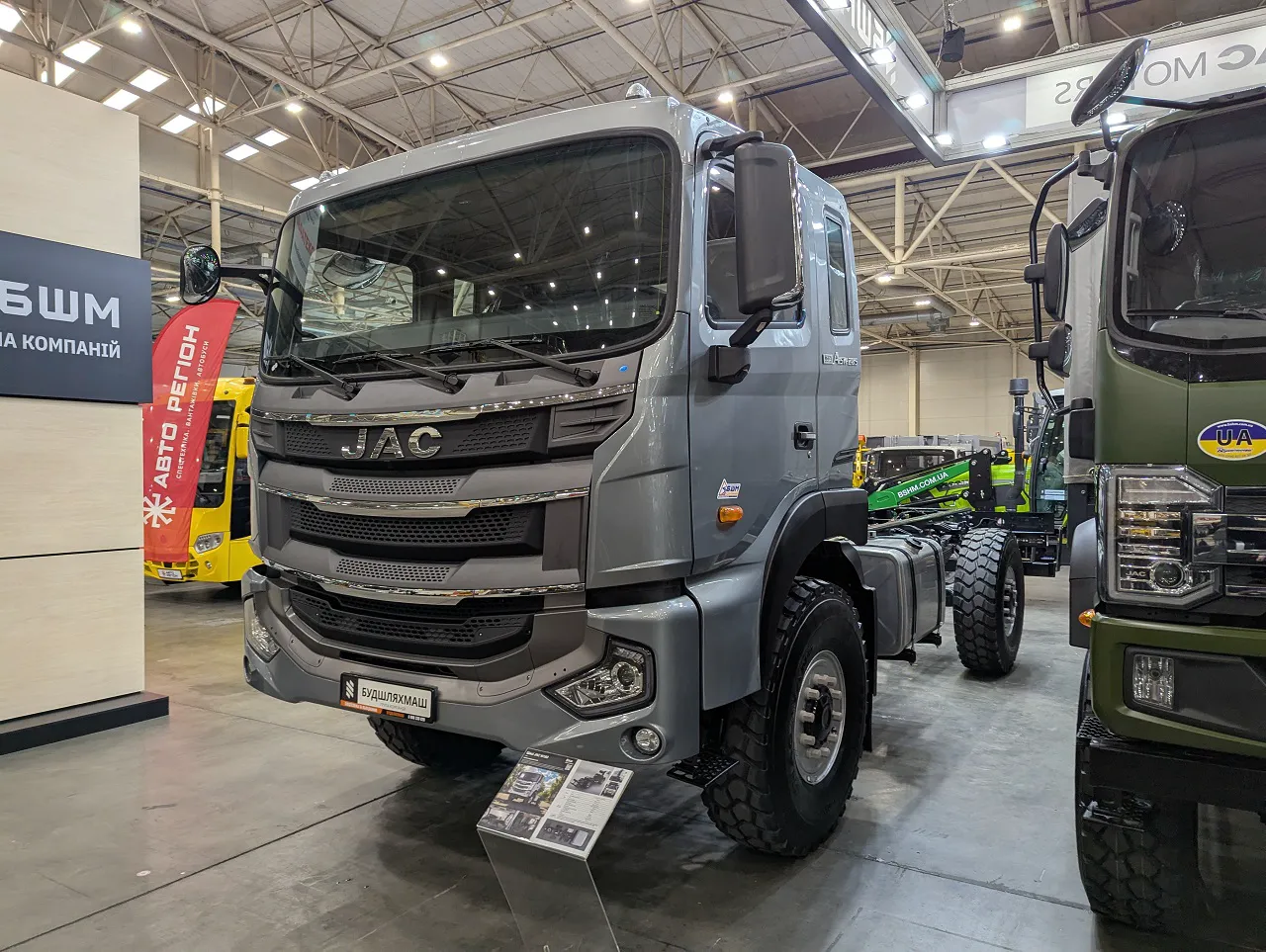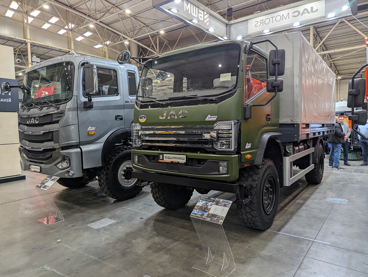На стенде компании «Будшляхмаш» отпраздновали украинский дебют сразу три полноприводных грузовика марки JAС. Это модель JAC N120 (4х4) с бортовой платформой, грузоподъемностью шасси 8 т, полной массой 12 т и турбодизелем Cummins (4,5 л, 206 л. с.).