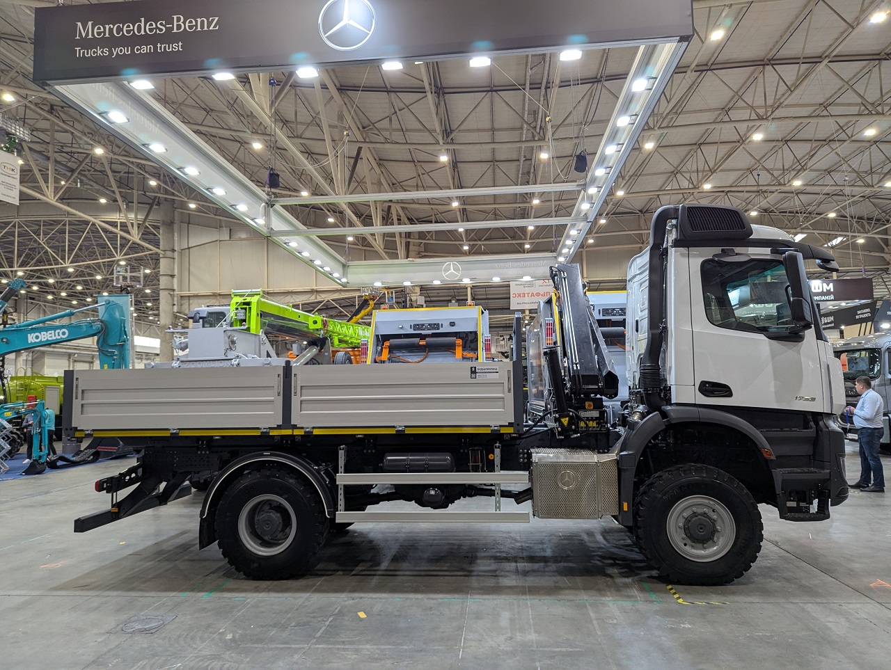 На другом шасси – Arocs 3333 (6х4) демонстрируется 25-тонный автокран. Рядом представлен и бортовой полноприводный автомобиль Arocs 1833 (4х4) с кузовом 4800 х 2300 х 600 мм и краном-манипулятором HIAB X-CL 8 B-2 грузоподъемностью до 2020 кг и максимальным вылетом 7,1 м.
