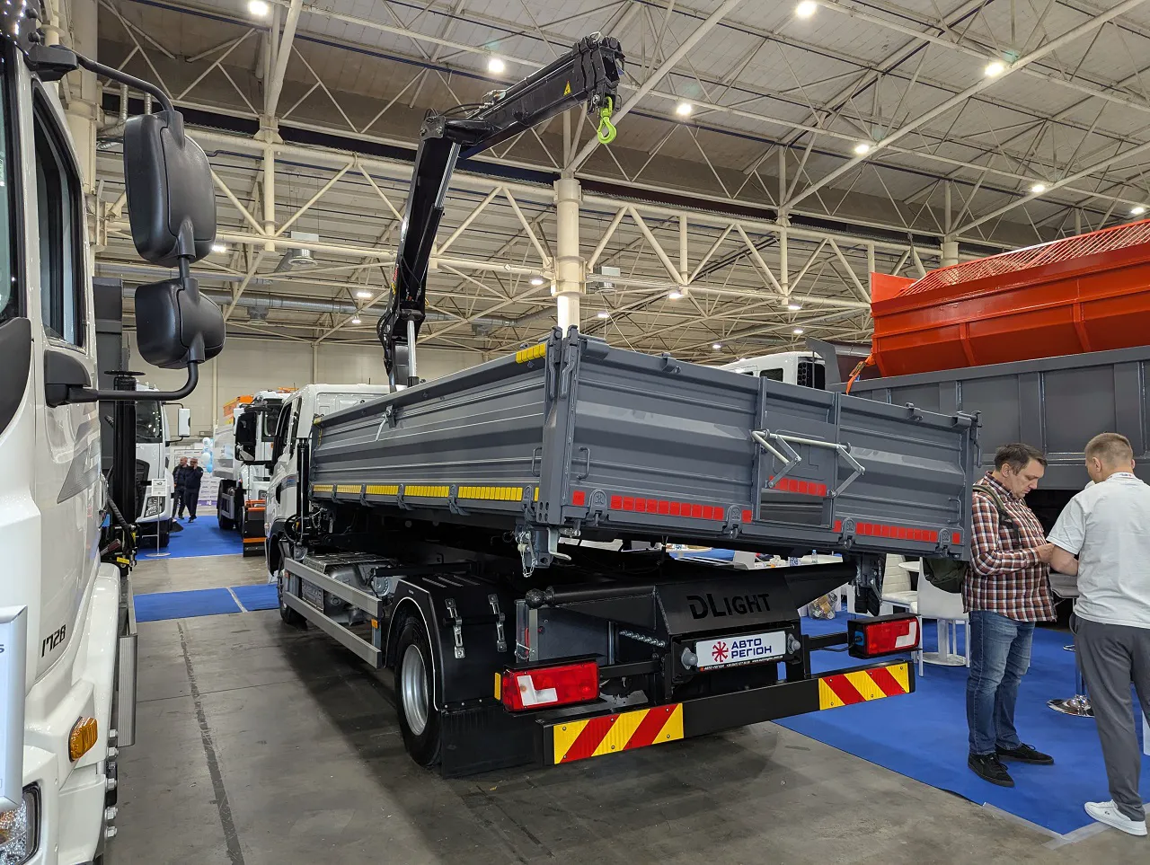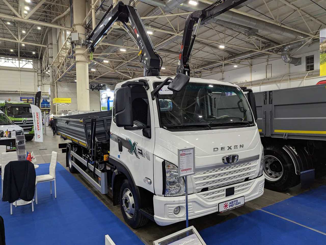 На шасси Daewoo Dexen представлен самосвал трехсторонней разгрузки и краном-манипулятором HIAB грузоподъемностью 1260 кг на вылете 7,7 м. Грузоподъемность шасси – 6990 кг, а полная масса – 10 200 кг.