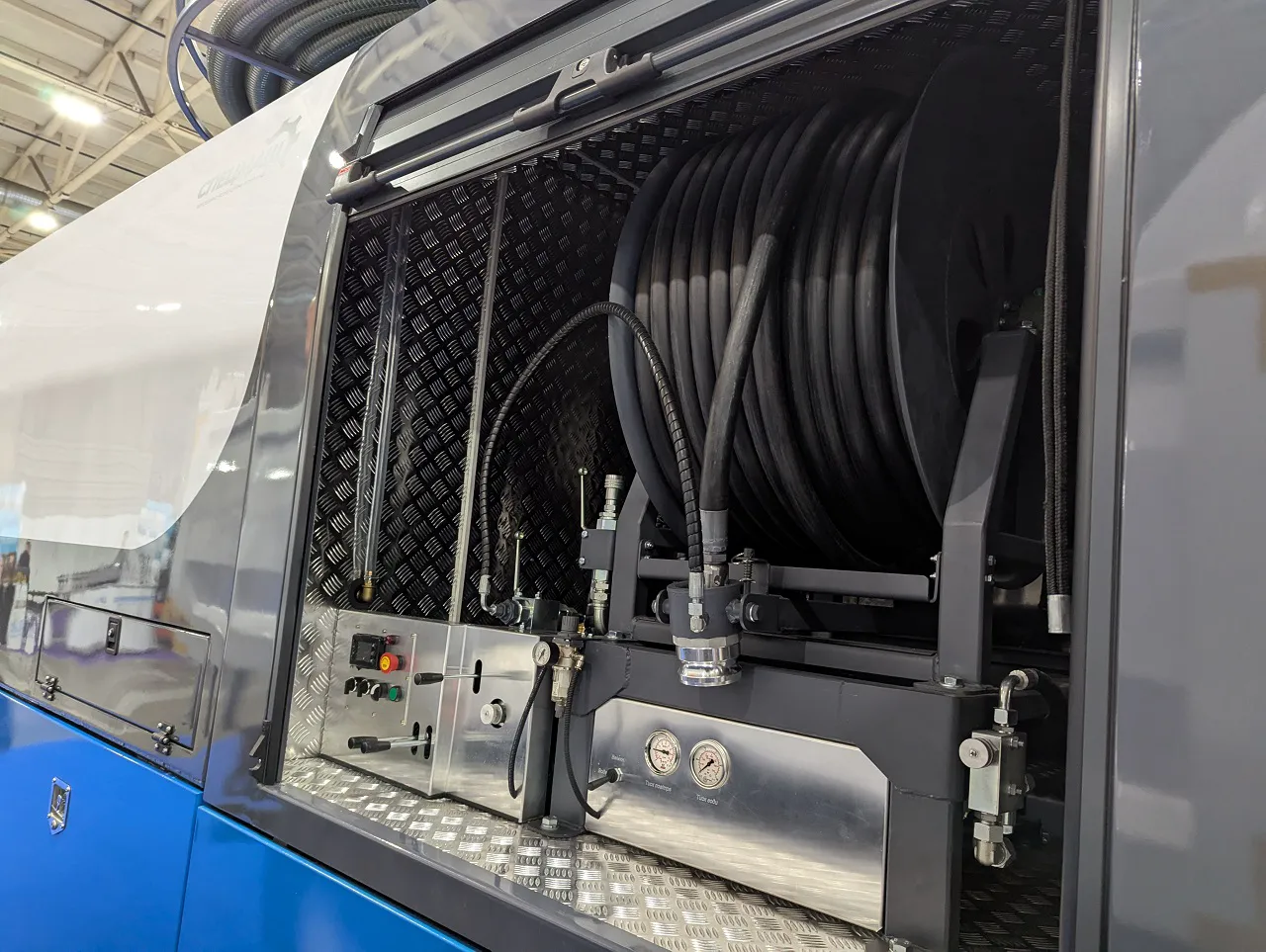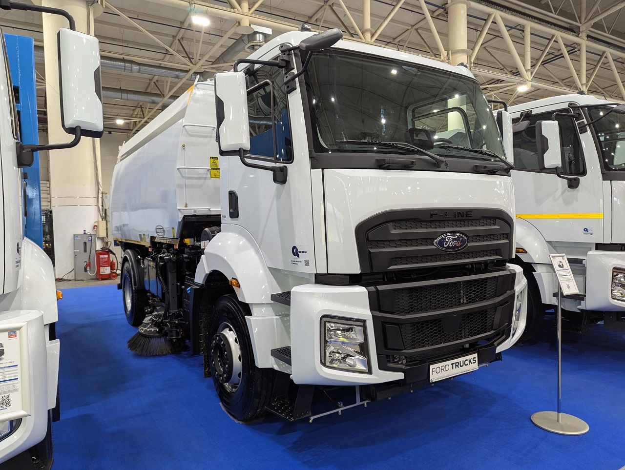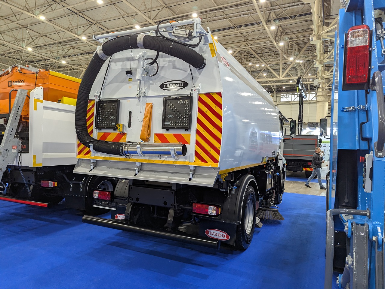 А на шасси F-Line 1833 DC (4×2) демонстрируется пылесос марки Erdemli. Ширина уборки составляет 3300 мм, объем бункера для мусора – 7 м куб., бака для воды – 1700 л. Двигатель JCB в 92 л. с. Максимальный вес всасываемого мусора – до 1 кг.