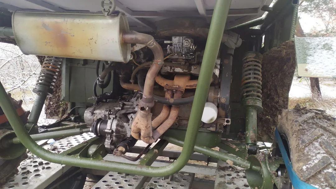 Источником движущей силы является вазовский двигатель. У нашей машины он 1,3-литровый карбюраторный на 64 л.с. из «девятки». Интересно, что его установили сзади авто, но не разворачивали, а просто передвинули. То есть радиатор так и стоит перед двигателем – прямо за двумя сиденьями. И чтобы он охлаждался, в кузове за спинками сидений прорезано «окно» с металлической сеткой.