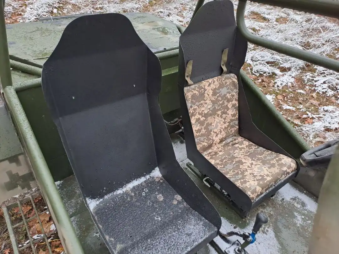 Так сказать салон имеет пару металлических кресел-ковшей. Но разработчики говорят, что при необходимости могут сделать такую же, но 4-местную машину. Сверху сидений пристегнуты поролоновые подушки, поэтому сидеть достаточно удобно, даже комфортно. А сам металлический лист сидений выступает дополнительной защитой от осколков.