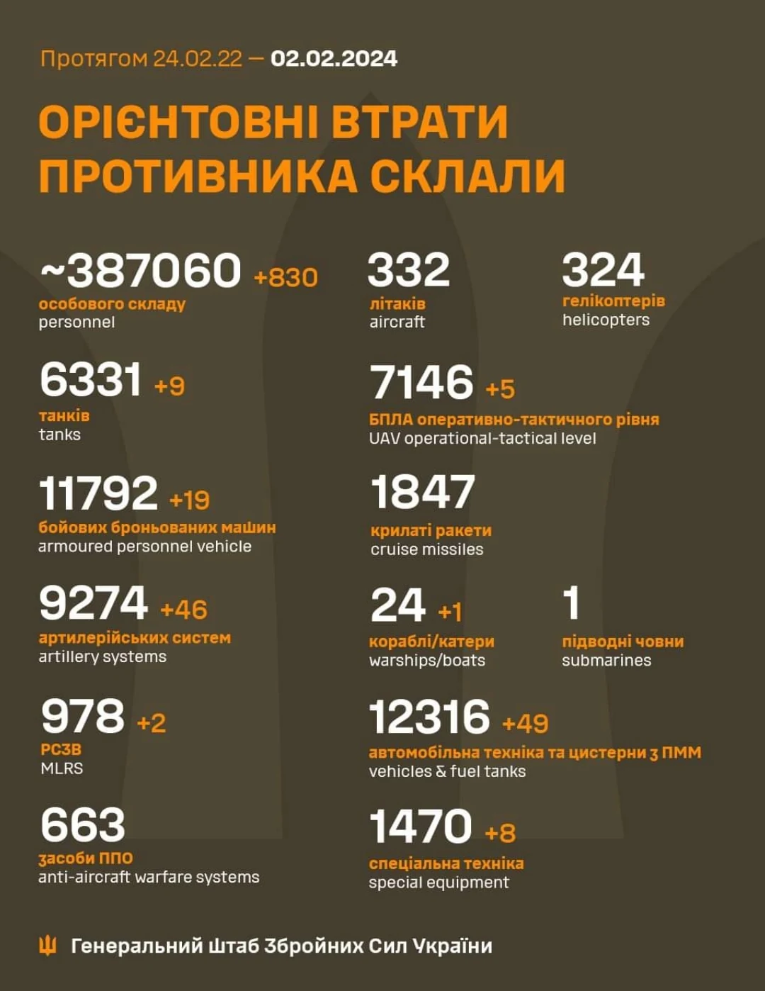 По данным Генерального штаба ВСУ, за прошедшие сутки – 1 февраля 2024 года уничтожено 9 российских танков (с начала полномасштабной войны – 6 331 ед.), а также 19 ед. бронетехники (всего – 11 792 ед.). Также подбито 49 автомобилей и автоцистерн (суммарно – 12 316 ед.) и 8 ед. спецтехники (за время – 1 470 ед.).